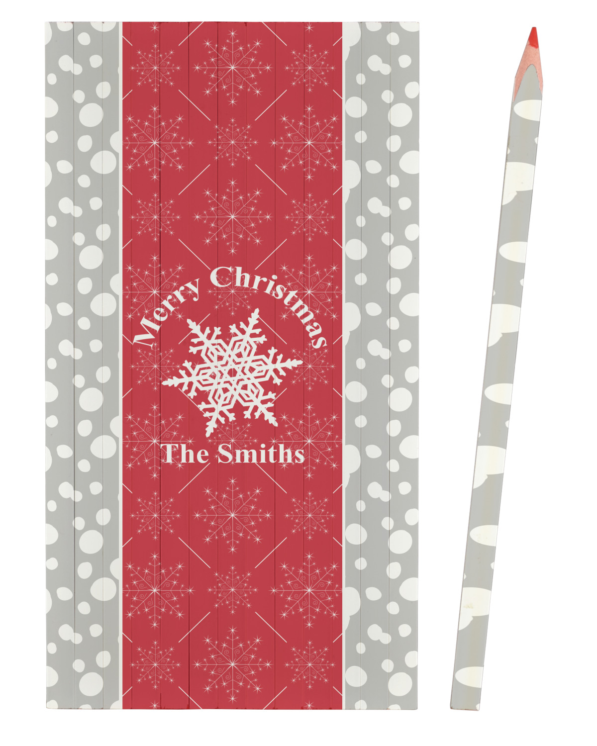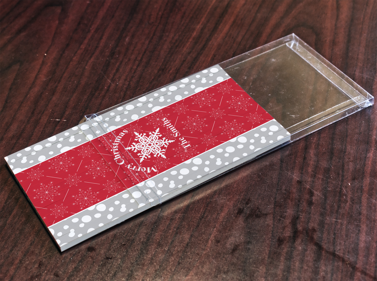 This design idea shows a calm grey and white snowflake filled background on either side of a red and white snowflake pattern in the middle. A big white snowflake have your greeting and personalization above and below it. This is a wonderful design idea to get your Christmas decorations started!