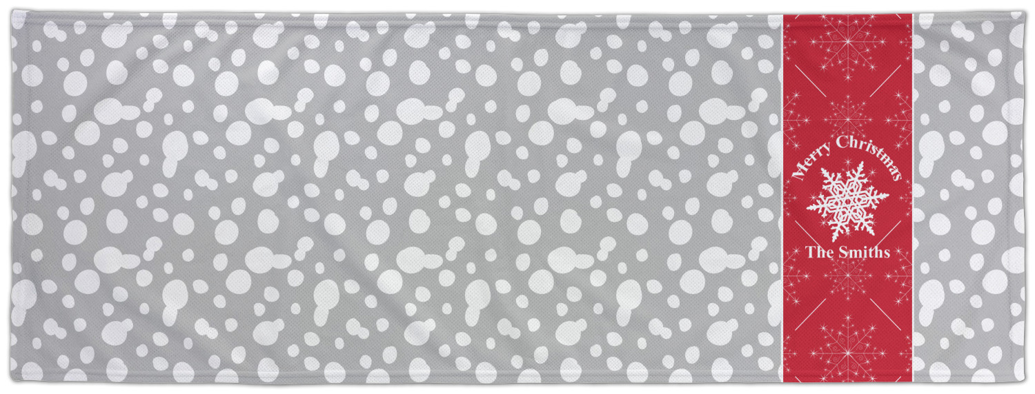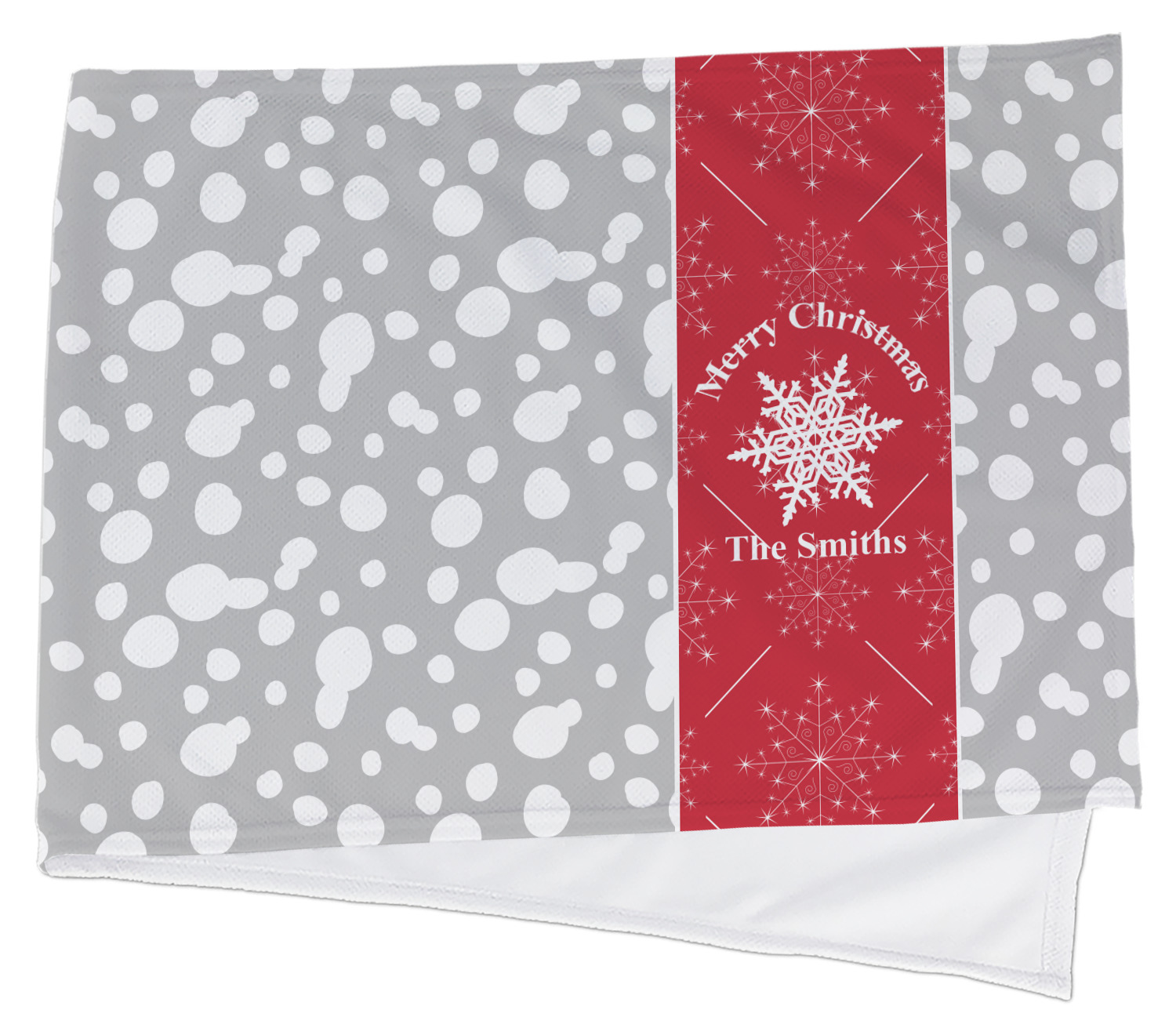This design idea shows a calm grey and white snowflake filled background on either side of a red and white snowflake pattern in the middle. A big white snowflake have your greeting and personalization above and below it. This is a wonderful design idea to get your Christmas decorations started!