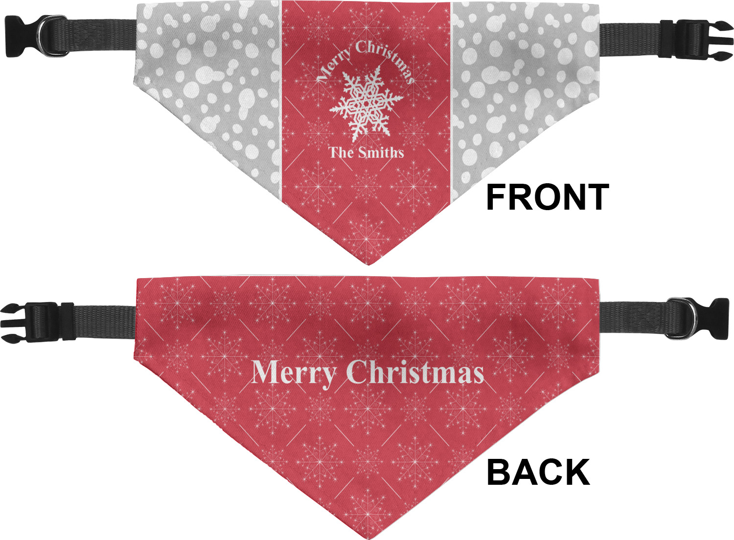 We print the front and back of these dog bandanas with your customized design. The bandana itself is made from a durable polyester, sewn together with a gap large enough to accommodate any collar. Regardless, the bandana includes a plain black, canvas collar with plastic snaps, that can easily be removed if desired. These dog bandana collars are available in four sizes: small, medium, large, and extra large. Please see our sizing chart for more information regarding the dimensions of each size.