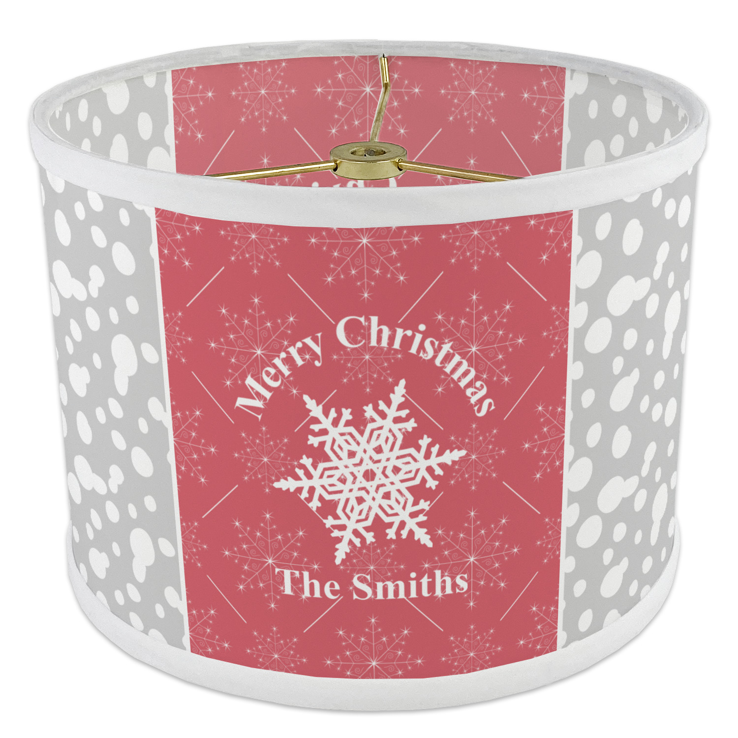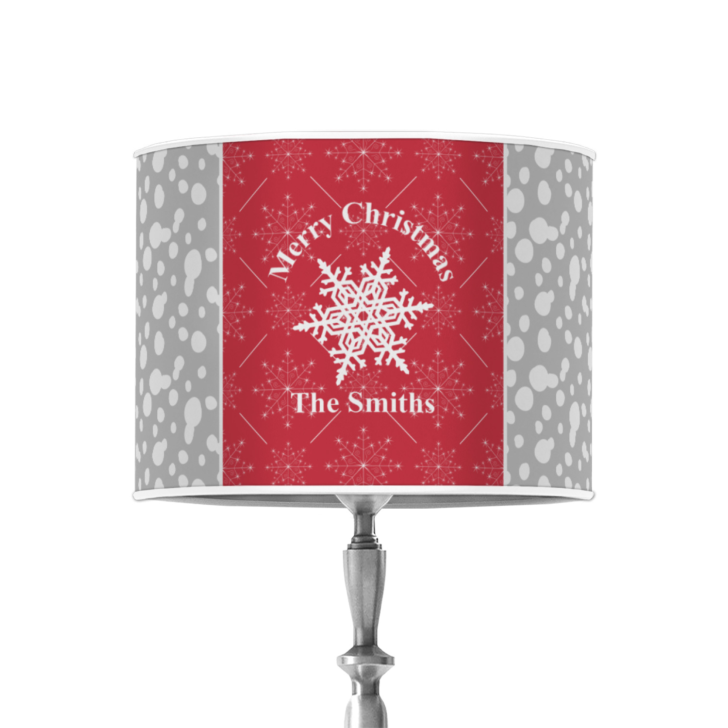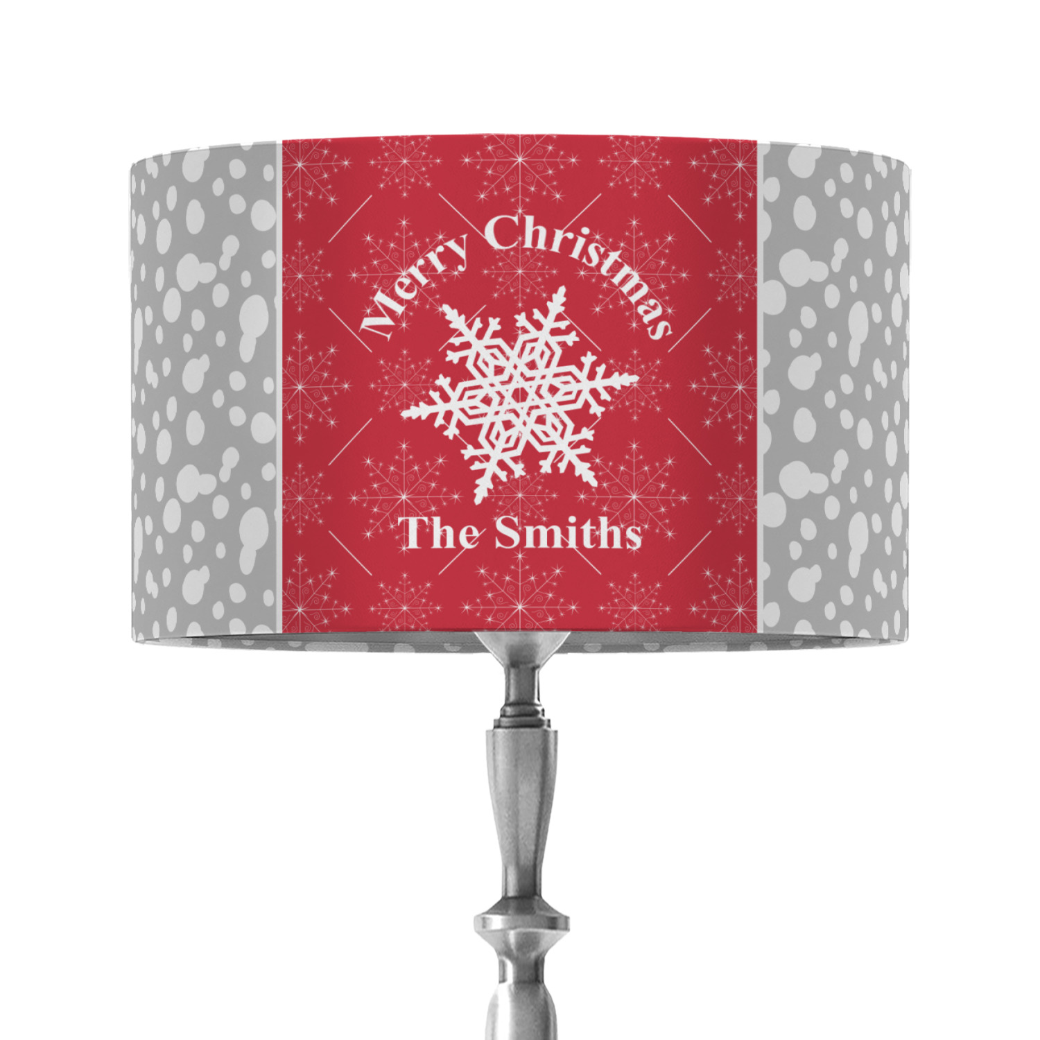 This design idea shows a calm grey and white snowflake filled background on either side of a red and white snowflake pattern in the middle. A big white snowflake have your greeting and personalization above and below it. This is a wonderful design idea to get your Christmas decorations started!