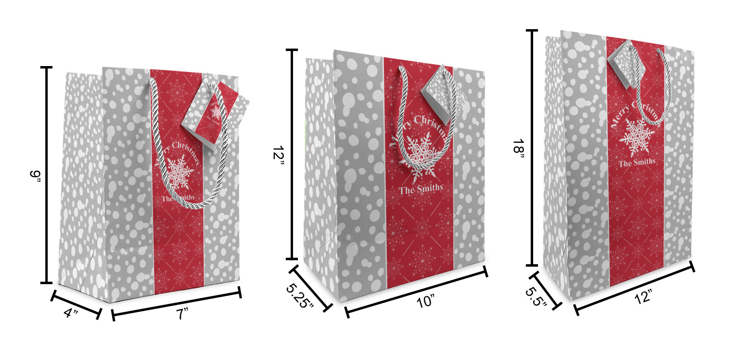 | Size (Varies By Option) | Small Gift Bag (7" x 4" x 9") Medium Gift Bag (10" x 5.25" x 12") Large Gift Bag (12" x 5.5" x 18") |