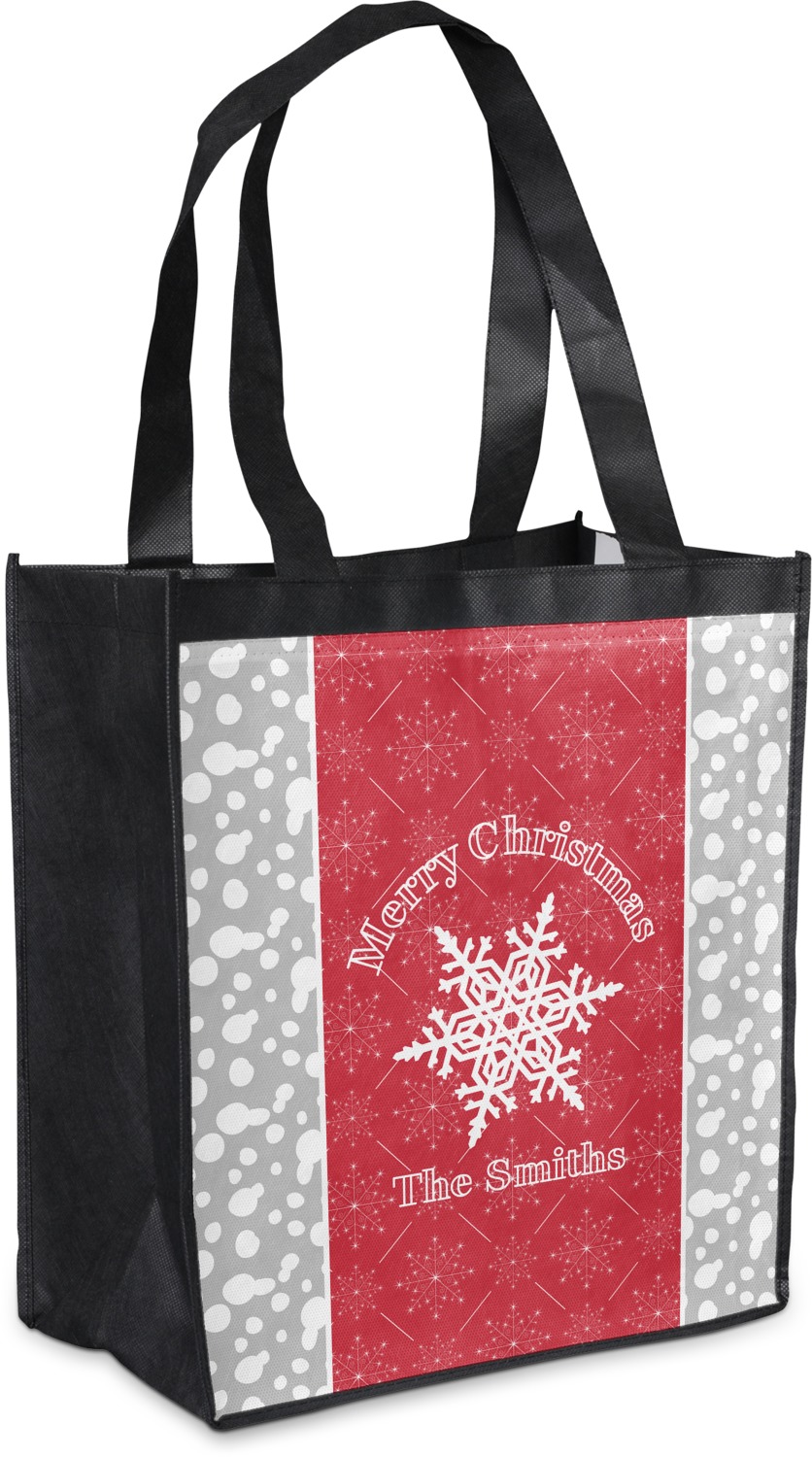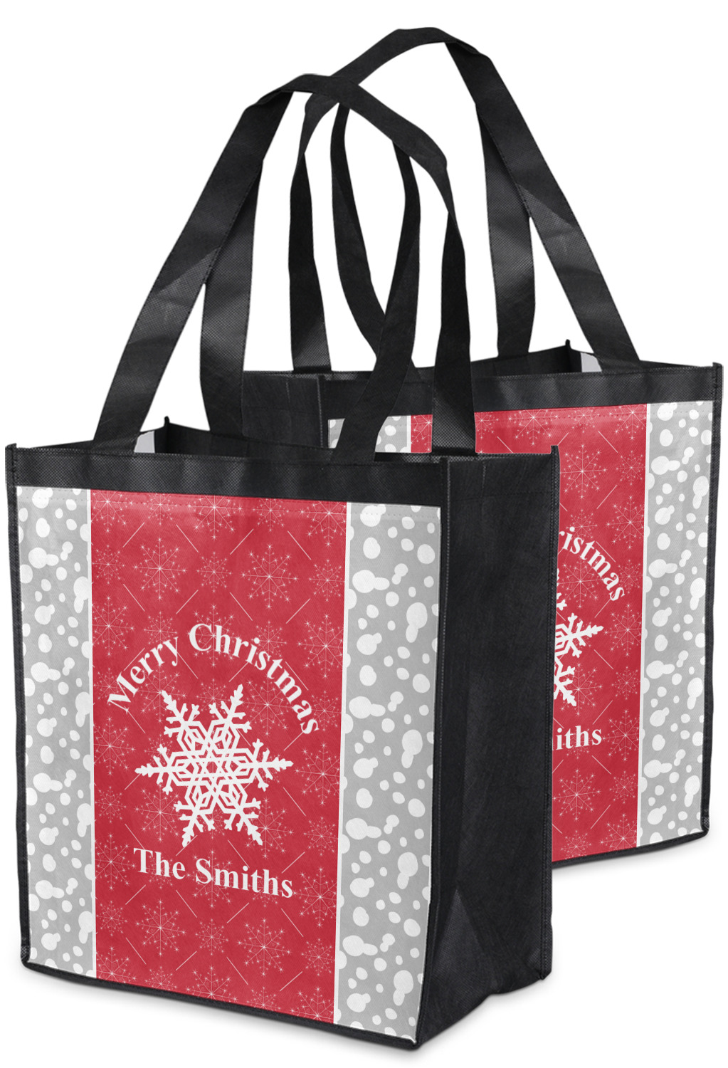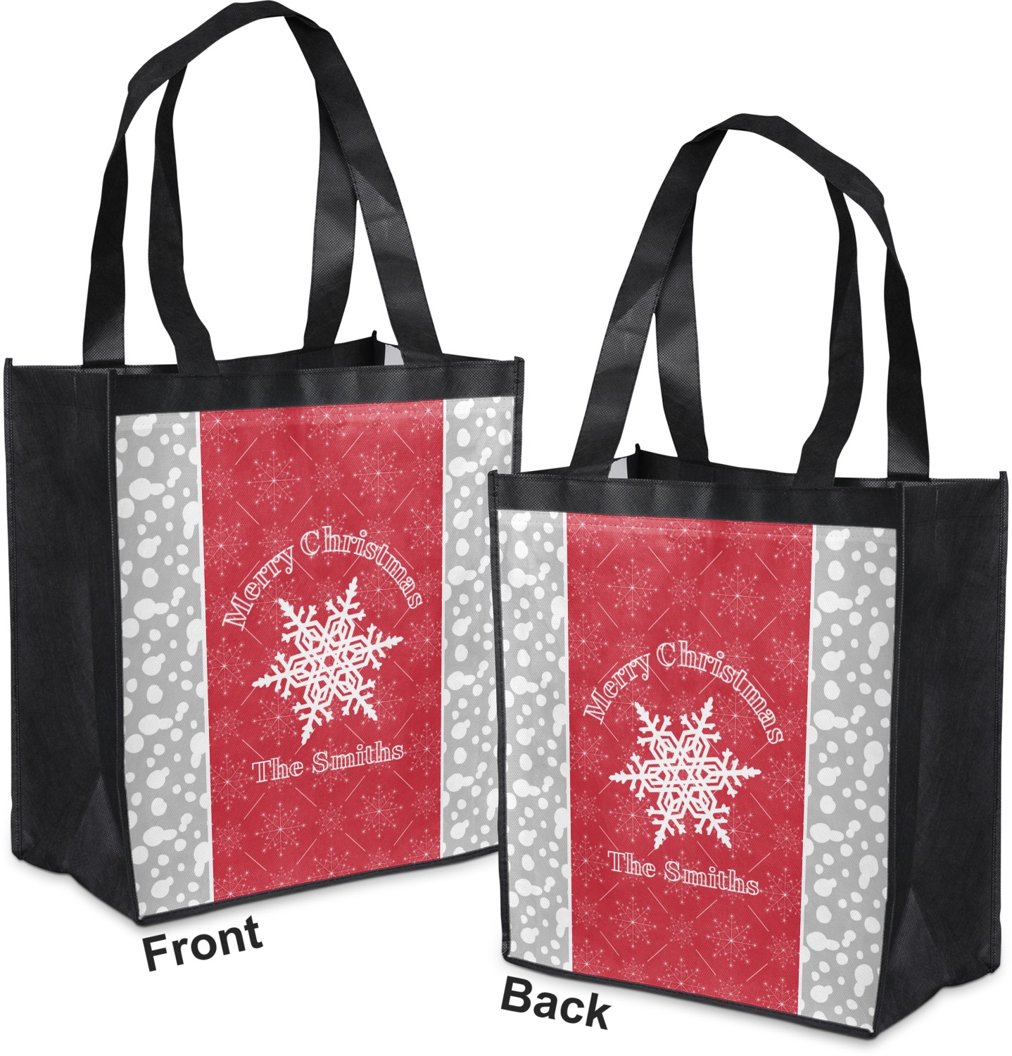 Made from a durable, biodegradable material, these reusable shopping bags can support up to 30 pounds of weight. With two large handles, measuring at 8.5 inches each, these personalized tote bags are easy to carry to your vehicle or home. The bag itself is 12 by 13.5 inches, and can expand to a depth of 7 inches. Your customization is printed on both the front and back, while the remaining sides, trim, and handle are a sleek, charcoal black.