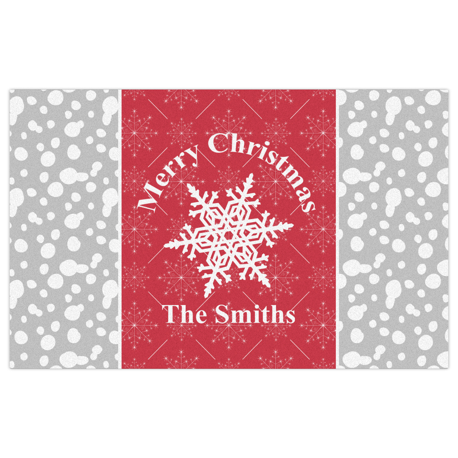 This design idea shows a calm grey and white snowflake filled background on either side of a red and white snowflake pattern in the middle. A big white snowflake have your greeting and personalization above and below it. This is a wonderful design idea to get your Christmas decorations started!