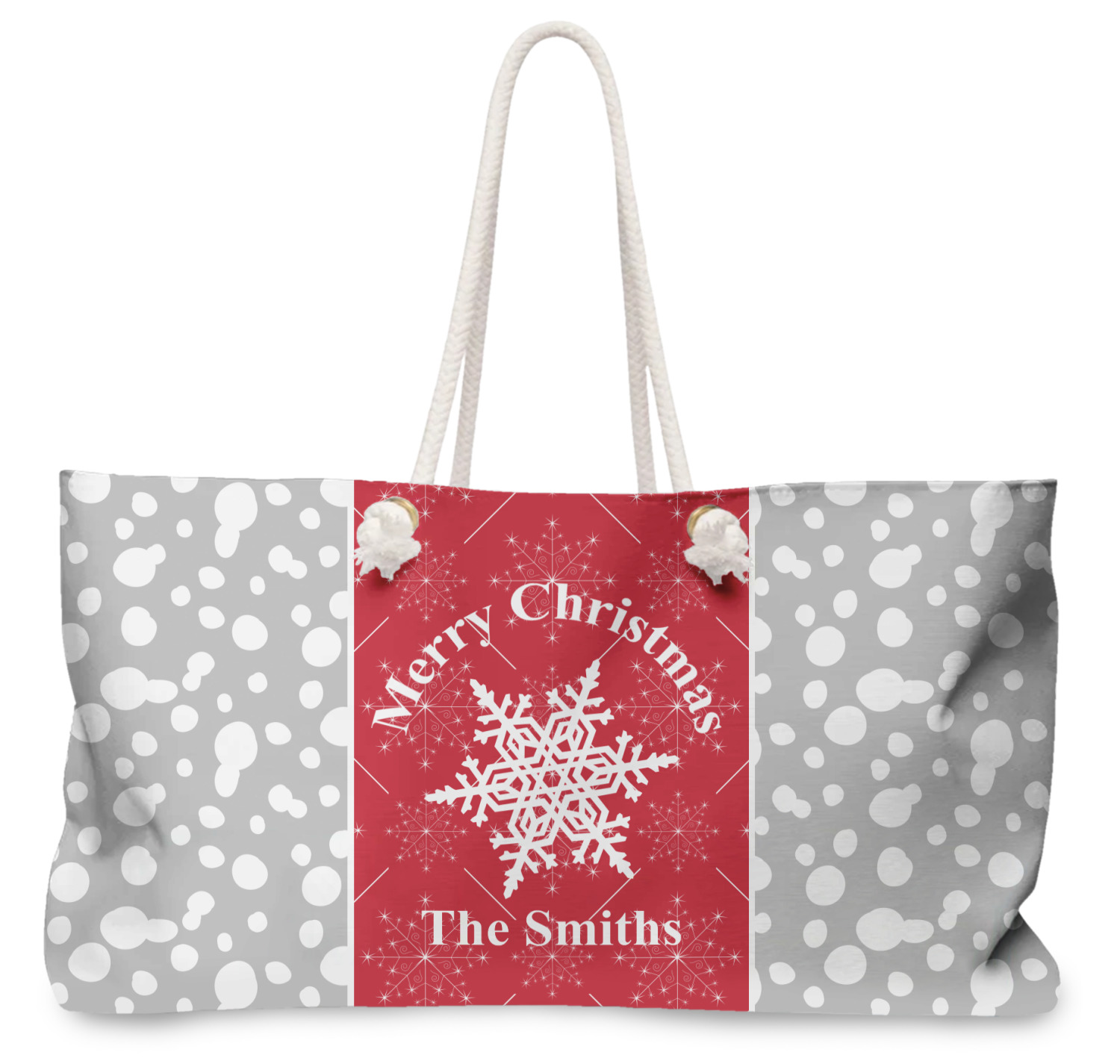 This design idea shows a calm grey and white snowflake filled background on either side of a red and white snowflake pattern in the middle. A big white snowflake have your greeting and personalization above and below it. This is a wonderful design idea to get your Christmas decorations started!