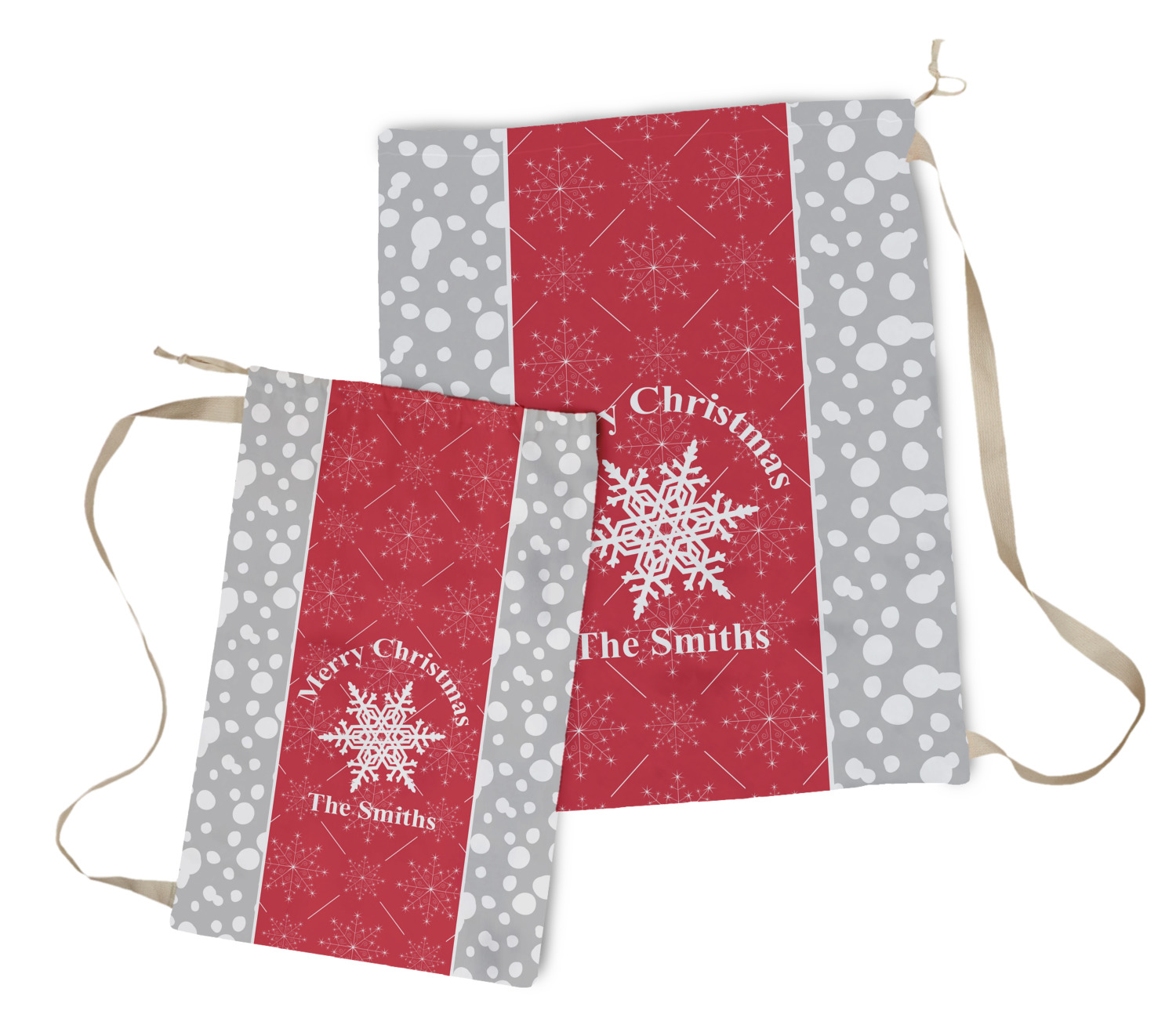 This design idea shows a calm grey and white snowflake filled background on either side of a red and white snowflake pattern in the middle. A big white snowflake have your greeting and personalization above and below it. This is a wonderful design idea to get your Christmas decorations started!
