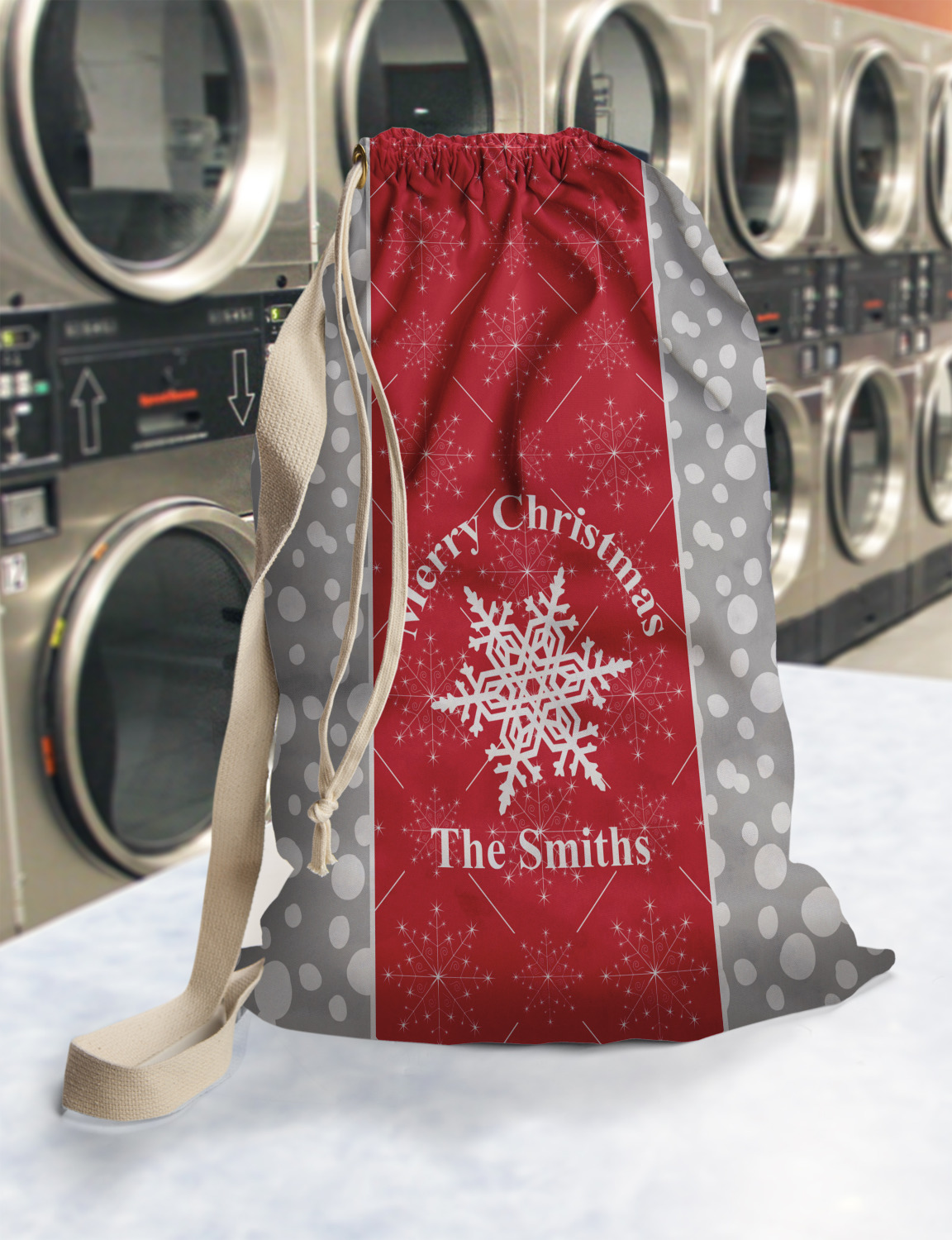 Carry your laundry in style with these customized laundry bags. Available in two sizes, featuring a natural colored woven strap and a cinch cord, these bags hold a lot of clothes or anything else you want to fit in them.