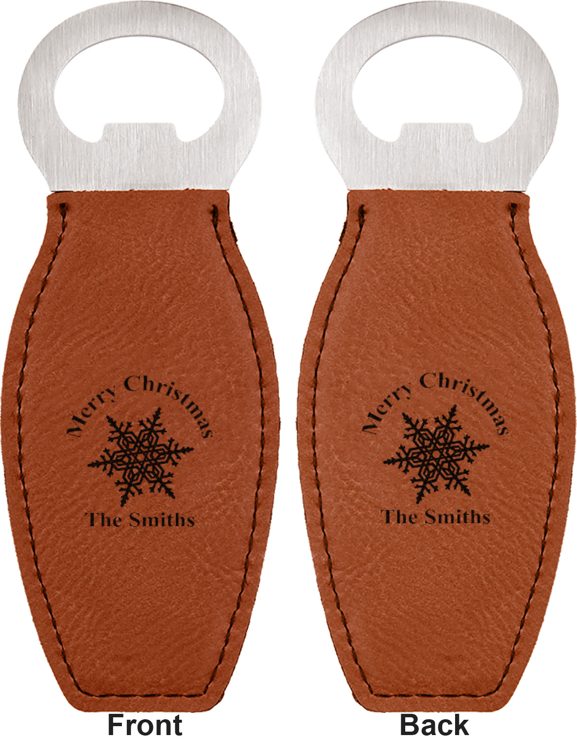 Built from stainless steel, these custom bottle openers are wrapped in a cognac-colored leatherette. Sharp, black stitching lines the edges for extra durability and a finished touch. Your personalization is laser-engraved onto the surface of this leatherette, leaving behind a crisp, black coloration. At 4.6 by 1.8 inches, this beer bottle opener gives you much of leverage when trying to open a stubborn bottle. On the opposite end of the opener, you'll find a magnet that you can use to display your new, unique bottle opener!