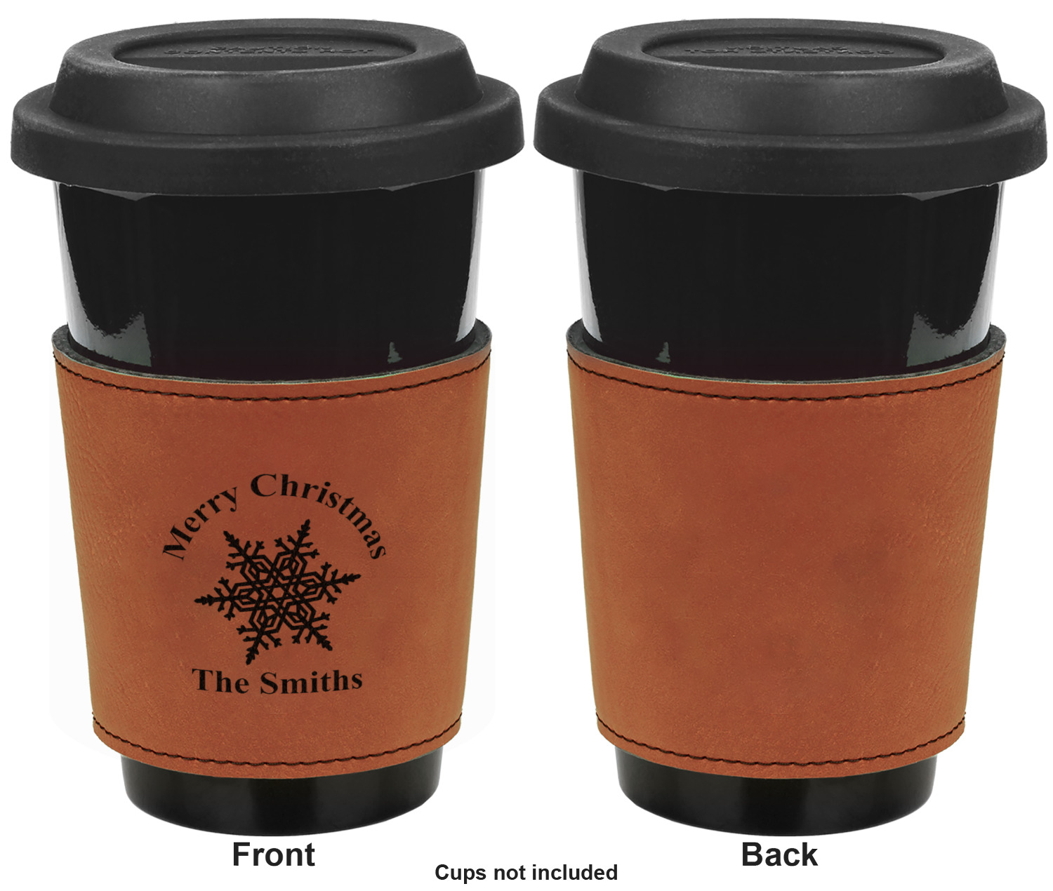 This cup sleeve is made from a suave, cognac-brown leatherette and finished with an intricate, black stitch. The interior of this can sleeve is fabricated from a thin foam material to help insulate your mug's contents. The sleeve is specifically made to suit tapered glasses or mugs, so the top's diameter is 3.5 inches, while the bottom's diameter is 2.75 inches. Your customized design will be laser engraved into the leatherette, leaving behind crisp, black imprint. With these products, we provide you with the option of engraving the front and back, or the front only.