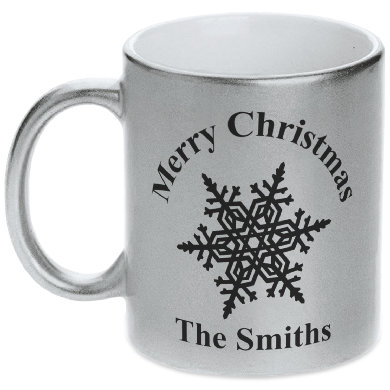 Our custom mugs are ceramic, which is great for keeping your tea or coffee warm! We offer two metallic mugs to personalize - Silver or Gold. Both styles hold around 11oz and have dimensions of approximately 3.75" x 3.5" x 4.75". Both the metallic mugs come in a matte finish and have glitter detailing to add a more pristine feel to the gold and silver base colors.