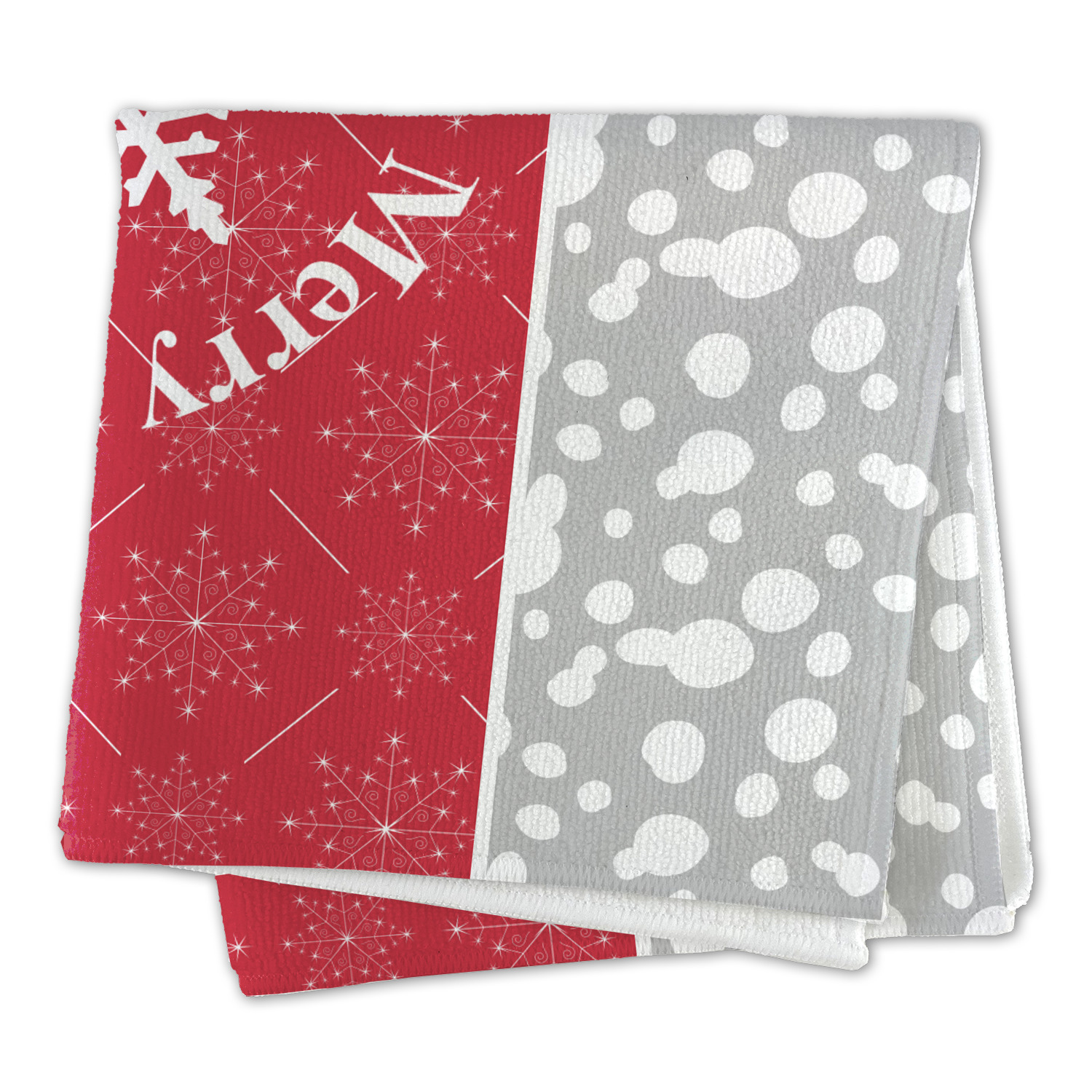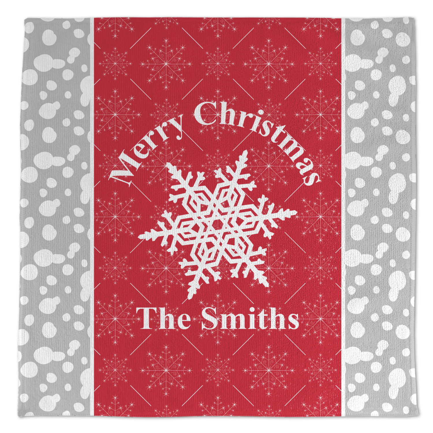 This design idea shows a calm grey and white snowflake filled background on either side of a red and white snowflake pattern in the middle. A big white snowflake have your greeting and personalization above and below it. This is a wonderful design idea to get your Christmas decorations started!