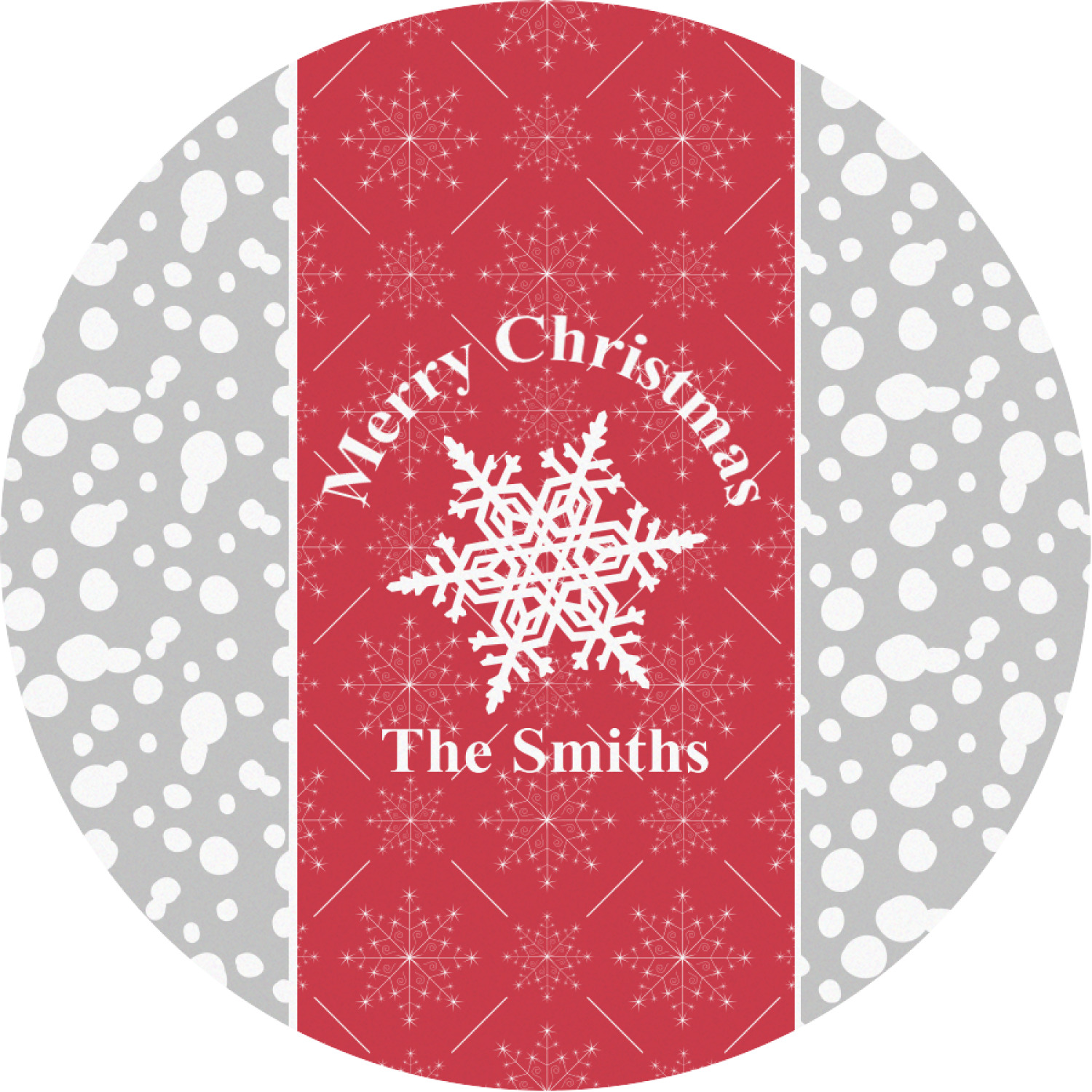 This design idea shows a calm grey and white snowflake filled background on either side of a red and white snowflake pattern in the middle. A big white snowflake have your greeting and personalization above and below it. This is a wonderful design idea to get your Christmas decorations started!