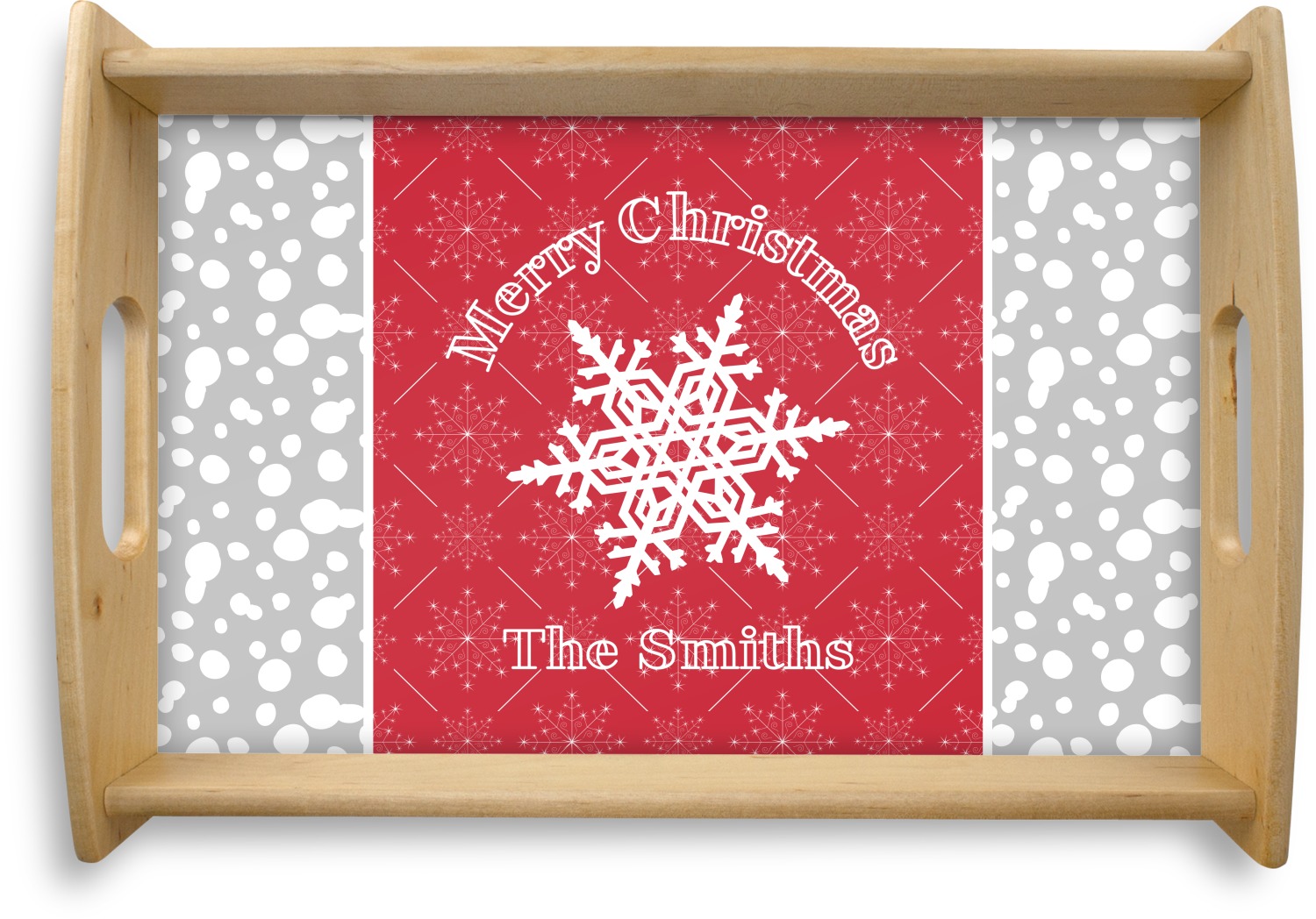 This serving tray with handles features square edges and two rounded sides, creating a very modern look. Each side is fabricated from a beautifully cut, natural wood. The bottom of the interior of the tray displays your customized design in bright, vibrant color. The tray is sold in both a black color and a natural wood look. Each variation of the wood serving tray has two sizes: Small, which is 14" x 10" x 2.25", and Large, which is 19.5" x 13.5" x 2.75".