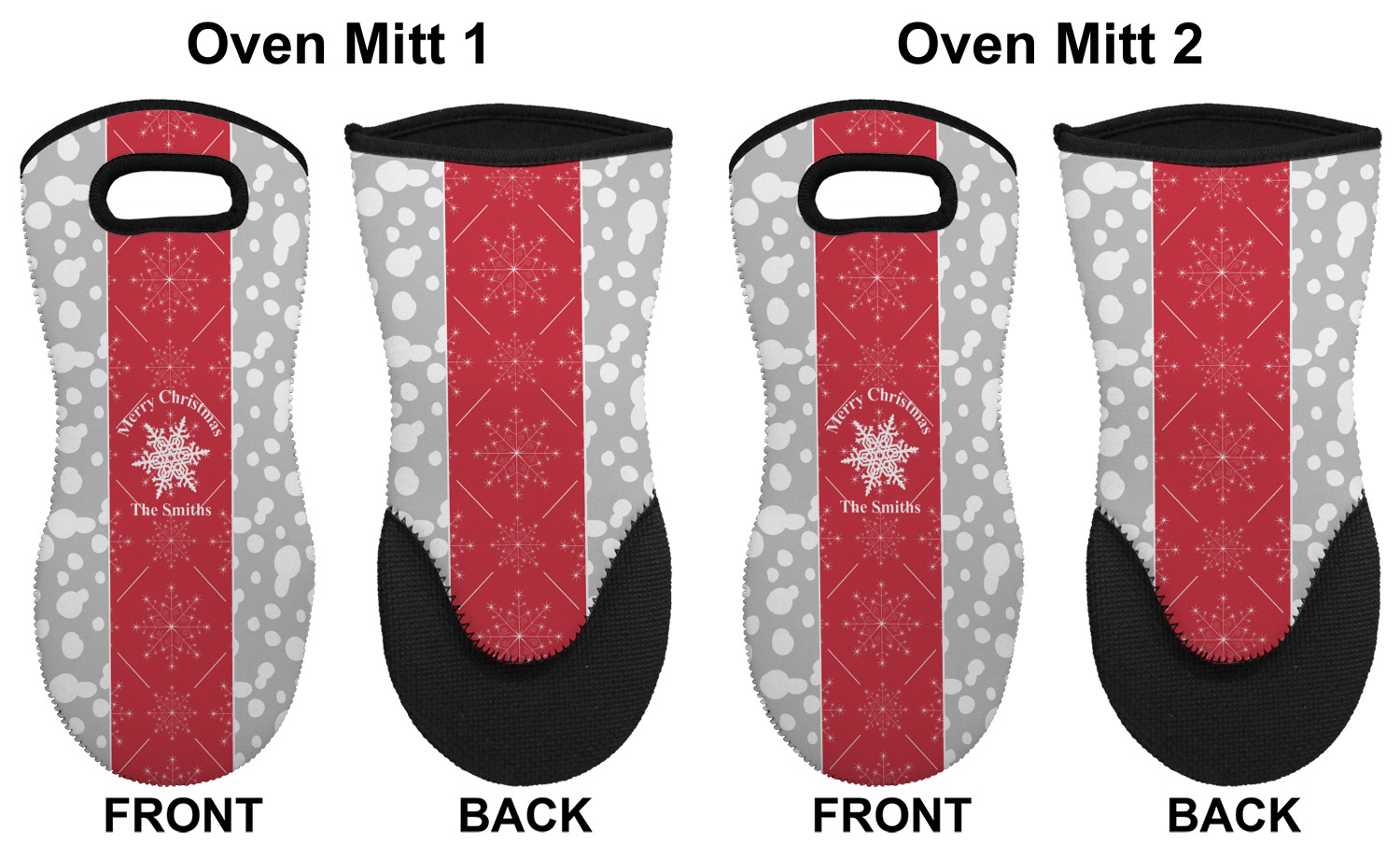 These heat resistant gloves are made entirely of a durable neoprene; the front features a softer texture, while the palm's side has a textured surface, meant to handle heat up to 500 degrees Fahrenheit. Thick, heavy duty stitching connects the two sides. A small, oval cutout appears on the front, and can be used to hang and store the mitt. Your personalization appears on the front, and the upper part of the back of the mitt. The style of these oven mitts are suitable for both the right and left hand, depending on your needs. If you need one for each hand, be sure to order two!