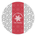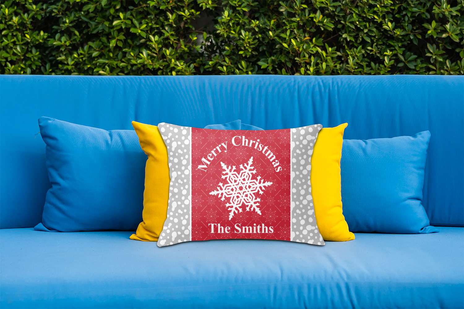 This design idea shows a calm grey and white snowflake filled background on either side of a red and white snowflake pattern in the middle. A big white snowflake have your greeting and personalization above and below it. This is a wonderful design idea to get your Christmas decorations started!