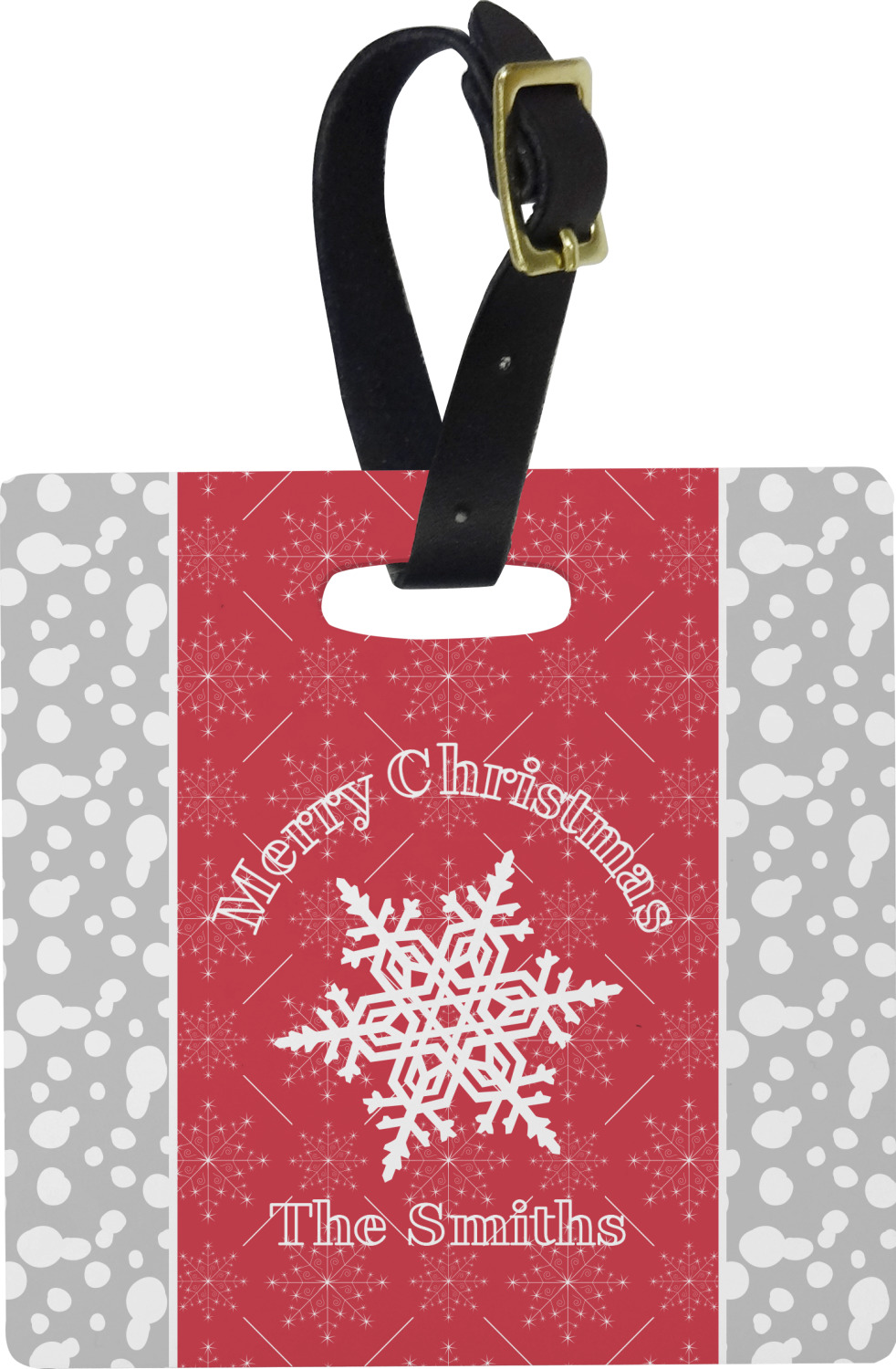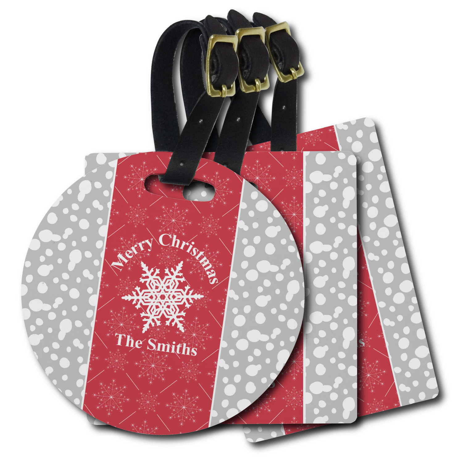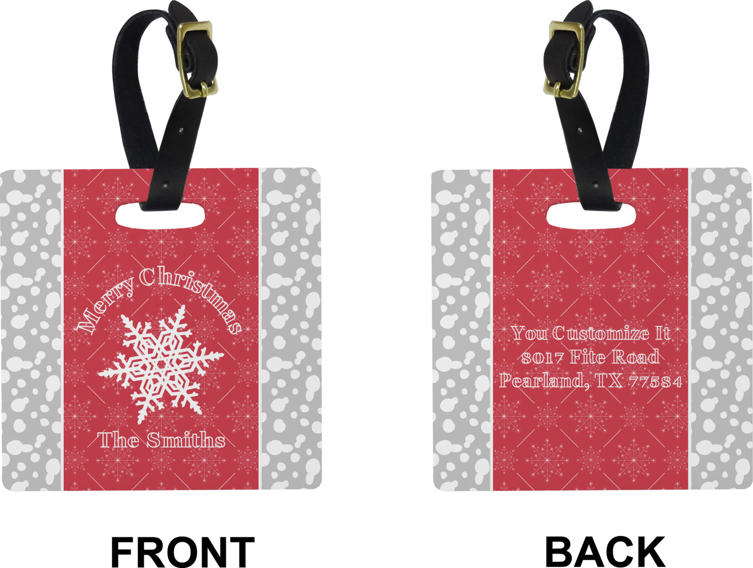 These personalized bag tags are sold in a variety of shapes, so that you may find the product that meets your vision exactly. We sell a round luggage tag, which measures at approximately 4" x 4". Our square luggage tag is about 3.5" x 3.5", while our rectangular version is 2.75" x 4 ".