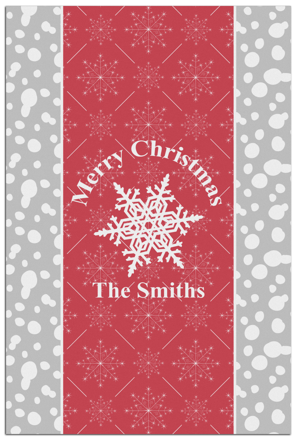 This design idea shows a calm grey and white snowflake filled background on either side of a red and white snowflake pattern in the middle. A big white snowflake have your greeting and personalization above and below it. This is a wonderful design idea to get your Christmas decorations started!