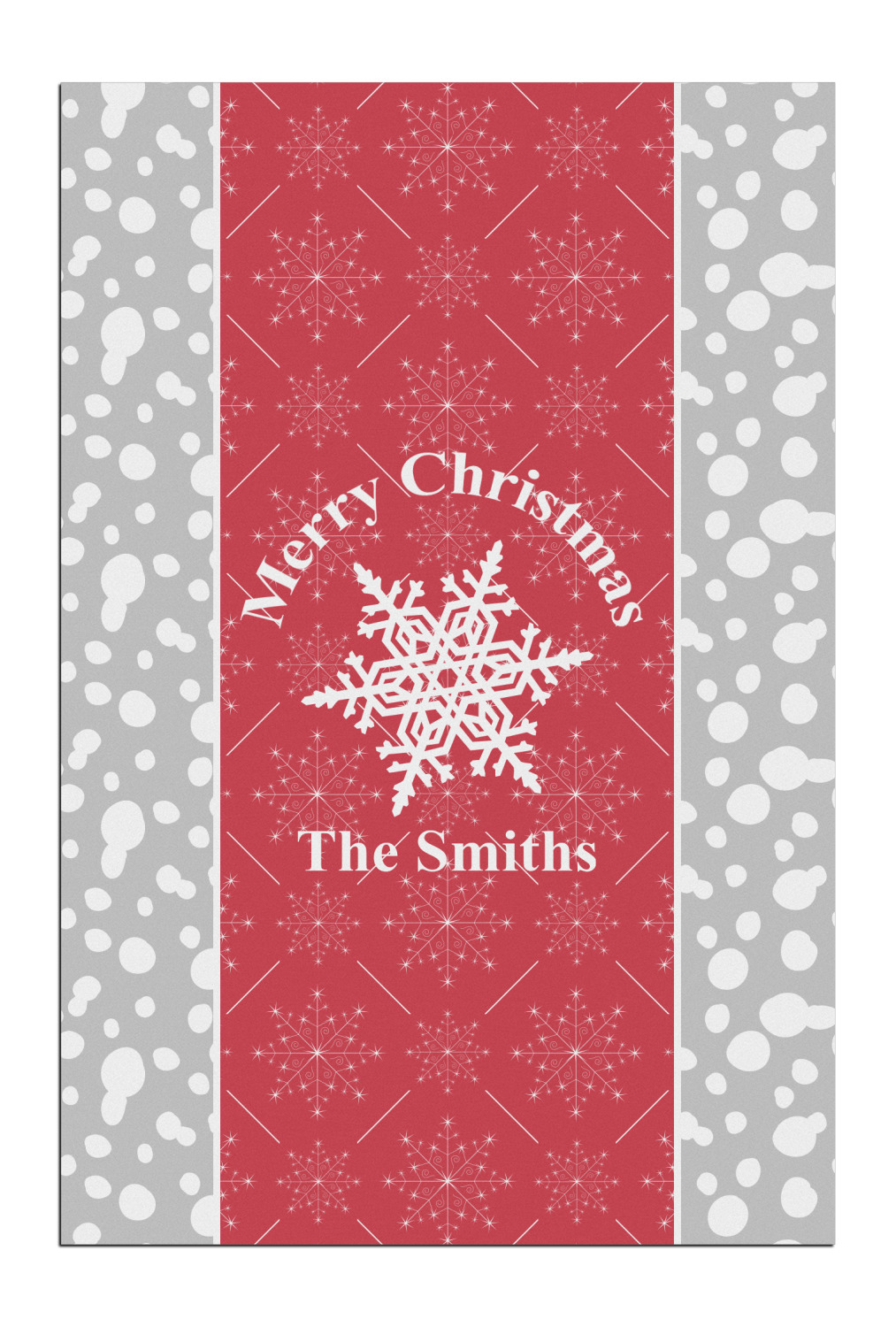 This design idea shows a calm grey and white snowflake filled background on either side of a red and white snowflake pattern in the middle. A big white snowflake have your greeting and personalization above and below it. This is a wonderful design idea to get your Christmas decorations started!