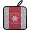 Our personalized pot holders feature a neoprene front that displays your personalization in vibrant colors. The backing of the hot pot holder is rubberized; the textured backing allows you to have a great grip when using this custom pot holder. The two materials are joined with a sleek, black trim, and the holder also includes an attached loop for hanging and storage. The pot holder is approximately 8.75 inches by 8.75 inches and 0.25 inches tall, while the fabric loop is 2.5 inches long. You can purchase a kitchen pot holder by itself or as a set of 2. We also offer a set including one pot holder and one oven mitt.