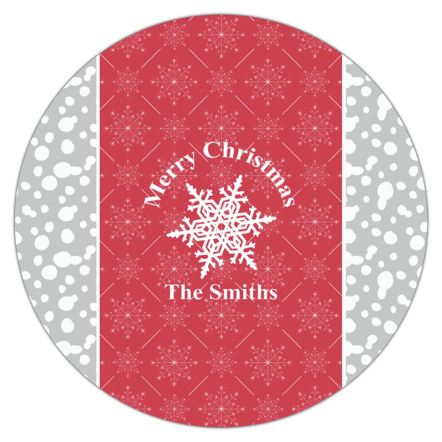 This design idea shows a calm grey and white snowflake filled background on either side of a red and white snowflake pattern in the middle. A big white snowflake have your greeting and personalization above and below it. This is a wonderful design idea to get your Christmas decorations started!