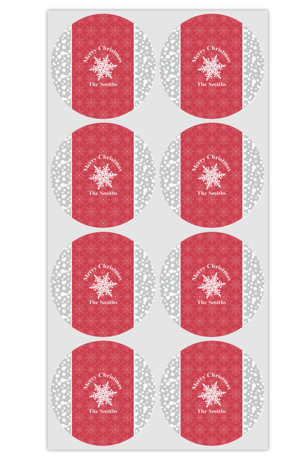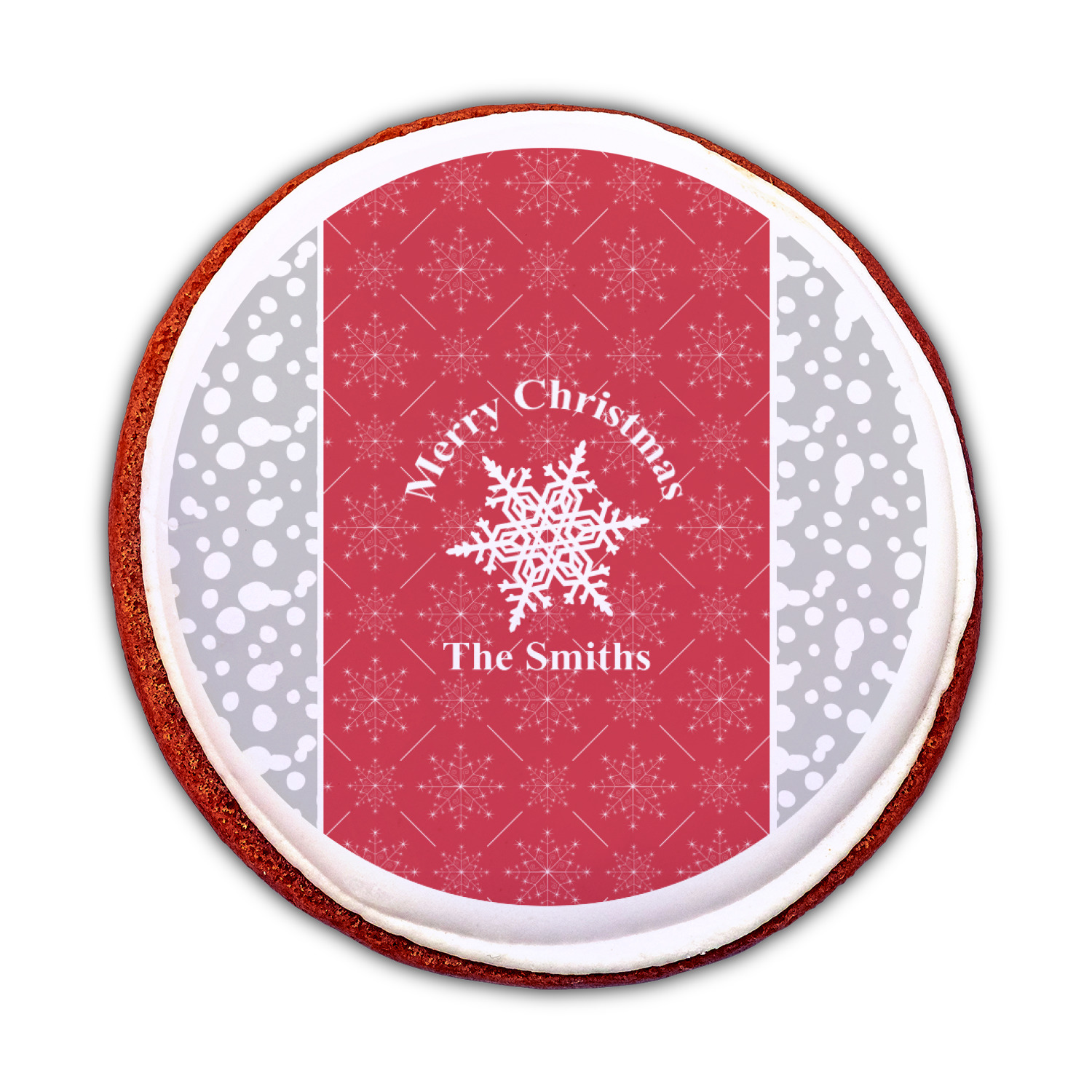 This design idea shows a calm grey and white snowflake filled background on either side of a red and white snowflake pattern in the middle. A big white snowflake have your greeting and personalization above and below it. This is a wonderful design idea to get your Christmas decorations started!