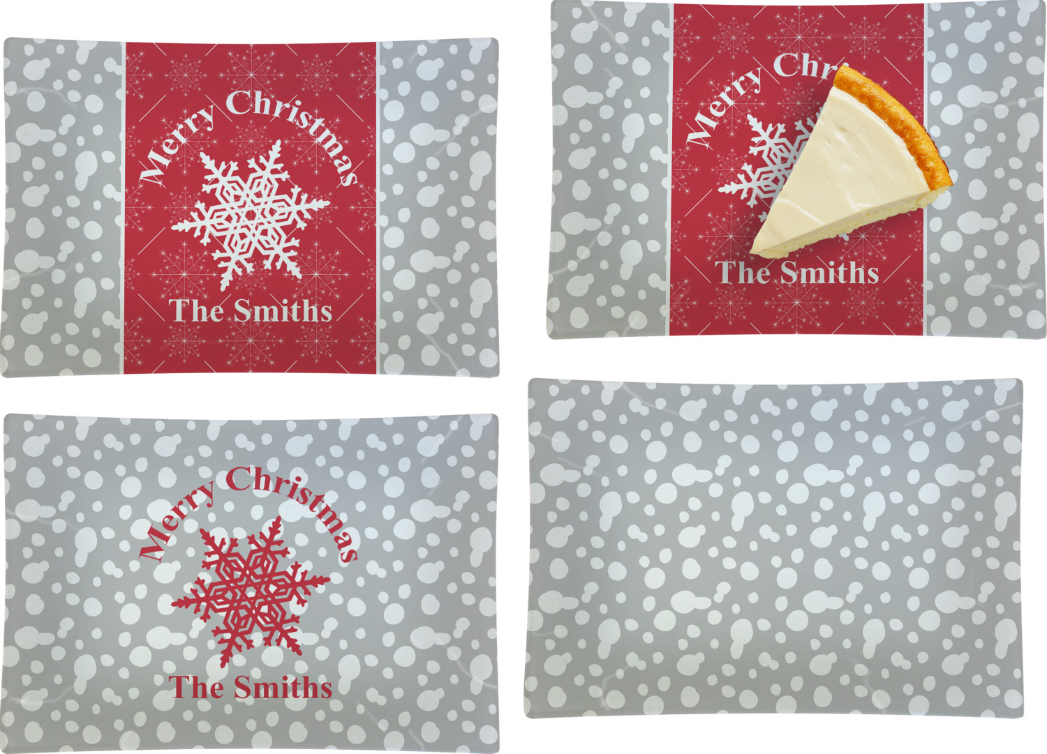 This design idea shows a calm grey and white snowflake filled background on either side of a red and white snowflake pattern in the middle. A big white snowflake have your greeting and personalization above and below it. This is a wonderful design idea to get your Christmas decorations started!