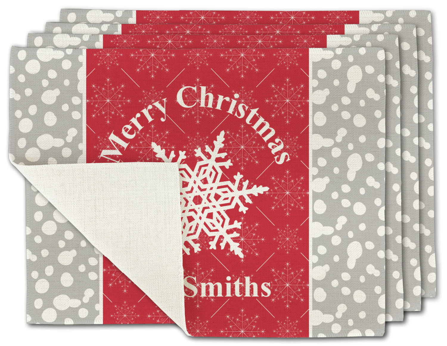 This design idea shows a calm grey and white snowflake filled background on either side of a red and white snowflake pattern in the middle. A big white snowflake have your greeting and personalization above and below it. This is a wonderful design idea to get your Christmas decorations started!