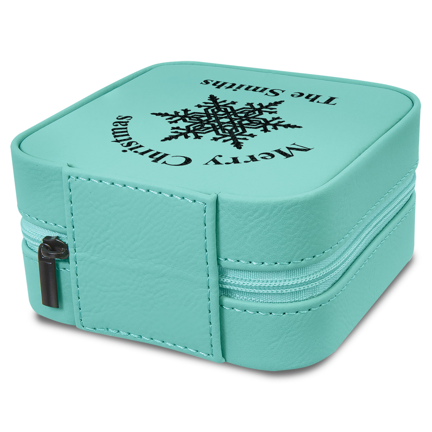 This square zippered travel jewelry box is made from leatherette and is available in four colors - classic cognac / rawhide, a beautiful teal. navy blue or pink. The tan colored soft velvet inside has compartments and hooks for all your jewelry - rings, chains, earrings, bangles etc.
