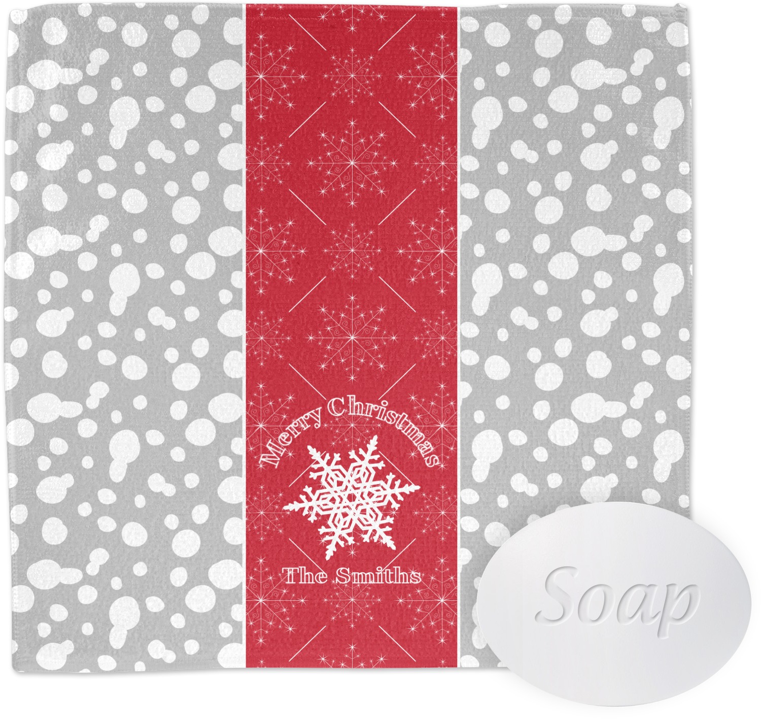 This design idea shows a calm grey and white snowflake filled background on either side of a red and white snowflake pattern in the middle. A big white snowflake have your greeting and personalization above and below it. This is a wonderful design idea to get your Christmas decorations started!