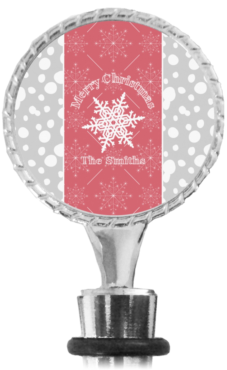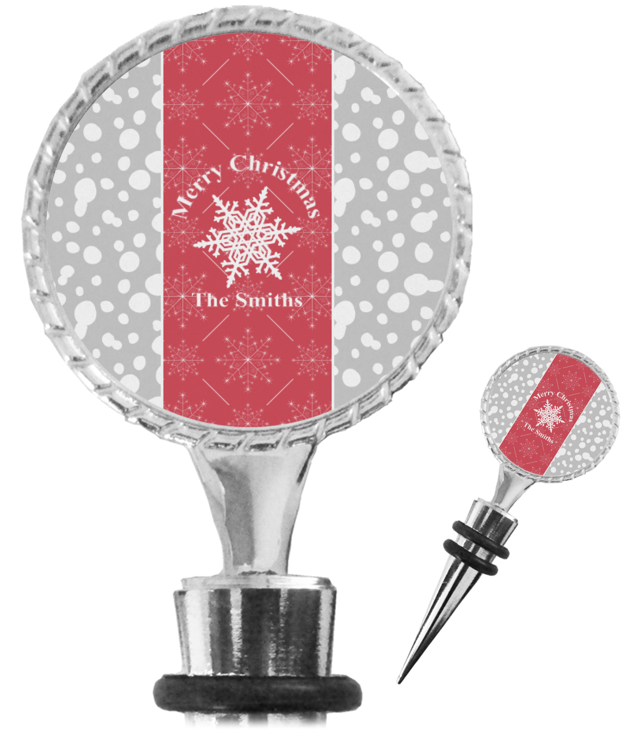 The top part of your bottle stopper is comprised of a zinc ring that displays your customization(s) in its middle, on both sides. The ring is heavy duty, with a bright chrome finish. The body of the wine stoppers have two silicone rings to provide an airtight seal. These wine bottle stoppers measure at 1.625" L x 0.8125" W x 4.625" H; your custom wine stopper is meant to fit into most standard-sized wine bottles.