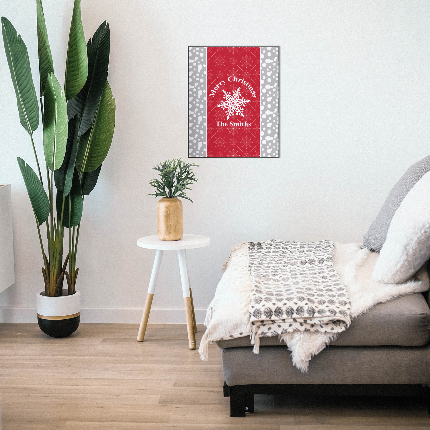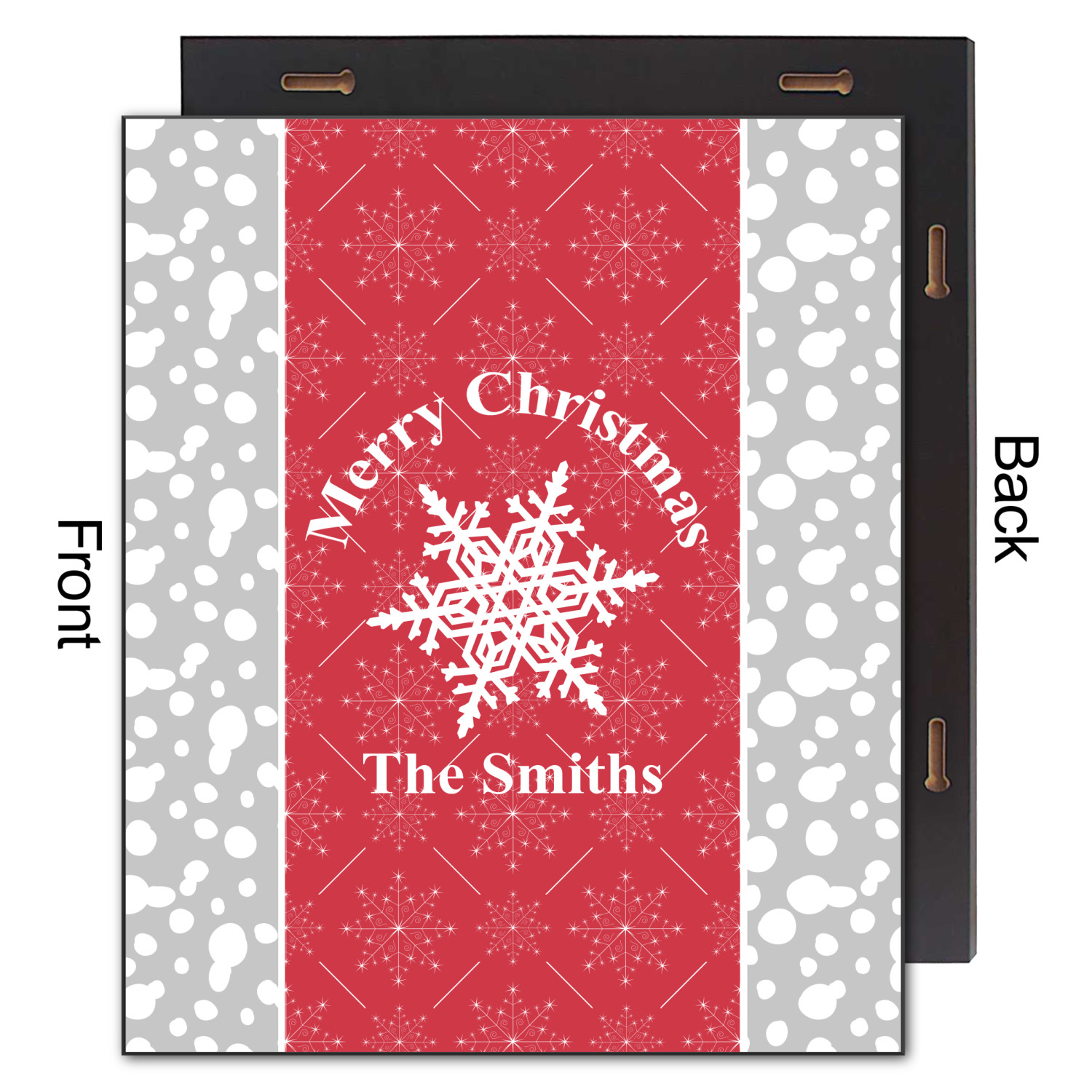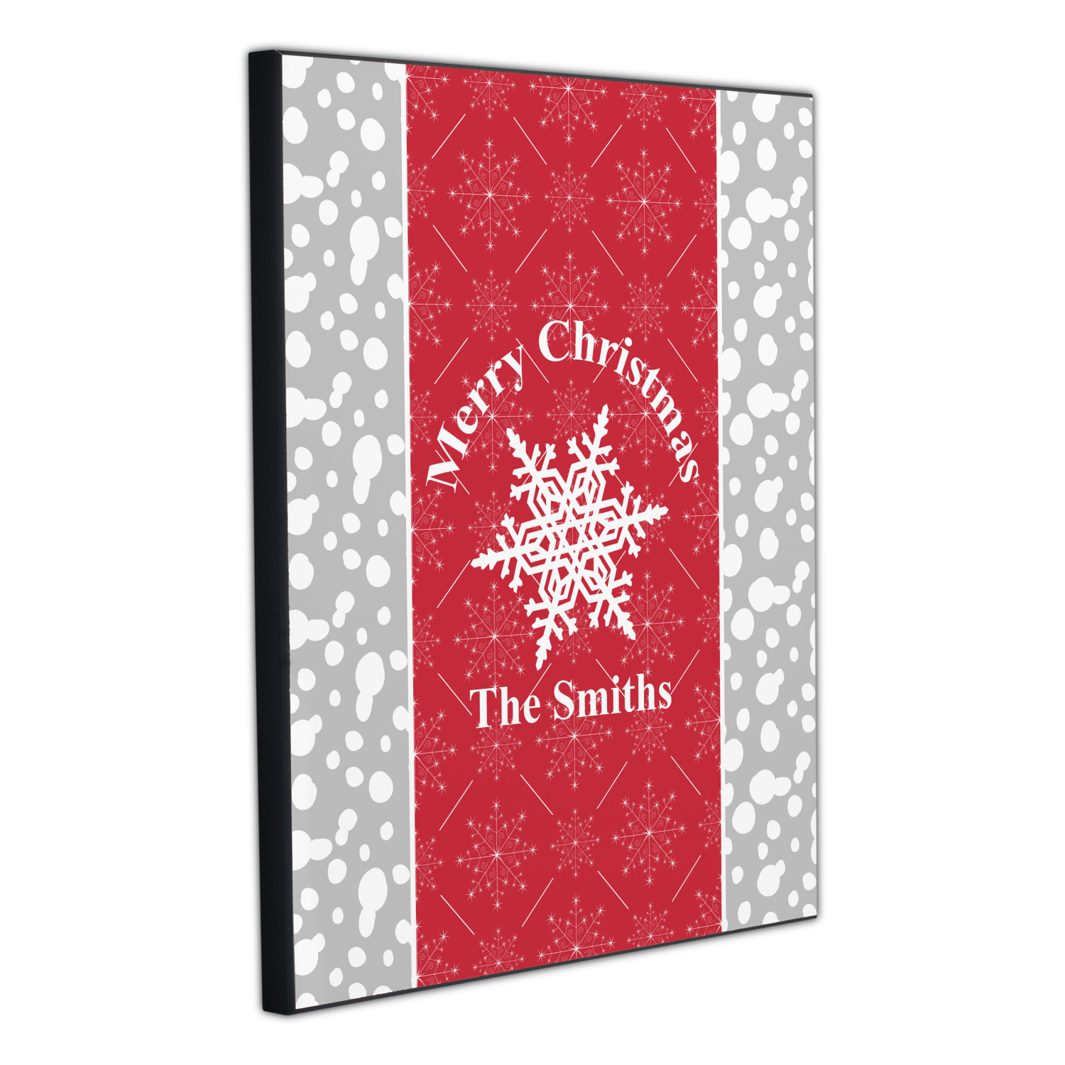 This design idea shows a calm grey and white snowflake filled background on either side of a red and white snowflake pattern in the middle. A big white snowflake have your greeting and personalization above and below it. This is a wonderful design idea to get your Christmas decorations started!