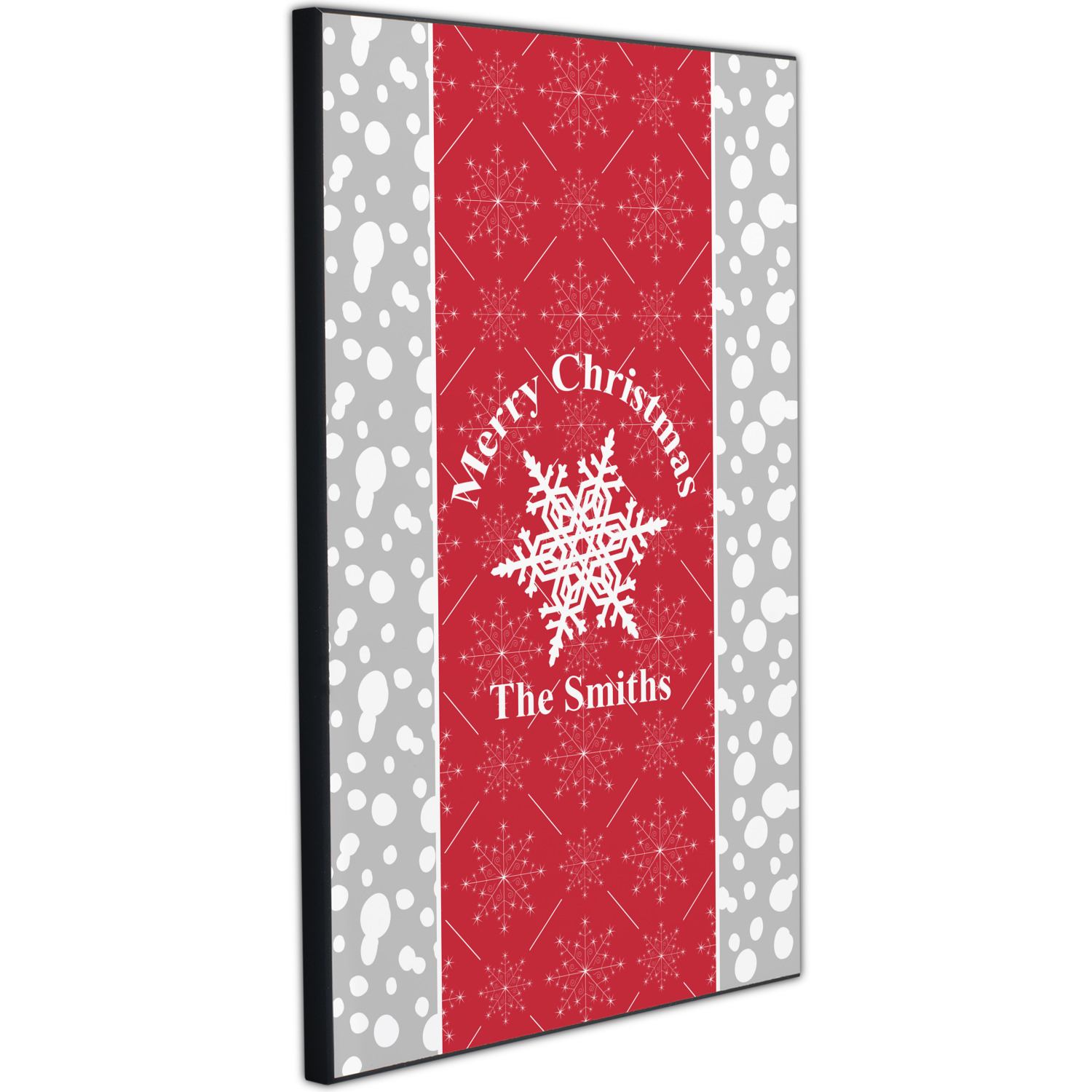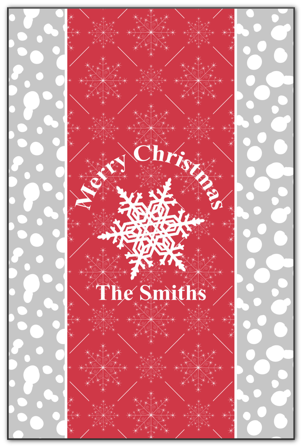 This design idea shows a calm grey and white snowflake filled background on either side of a red and white snowflake pattern in the middle. A big white snowflake have your greeting and personalization above and below it. This is a wonderful design idea to get your Christmas decorations started!