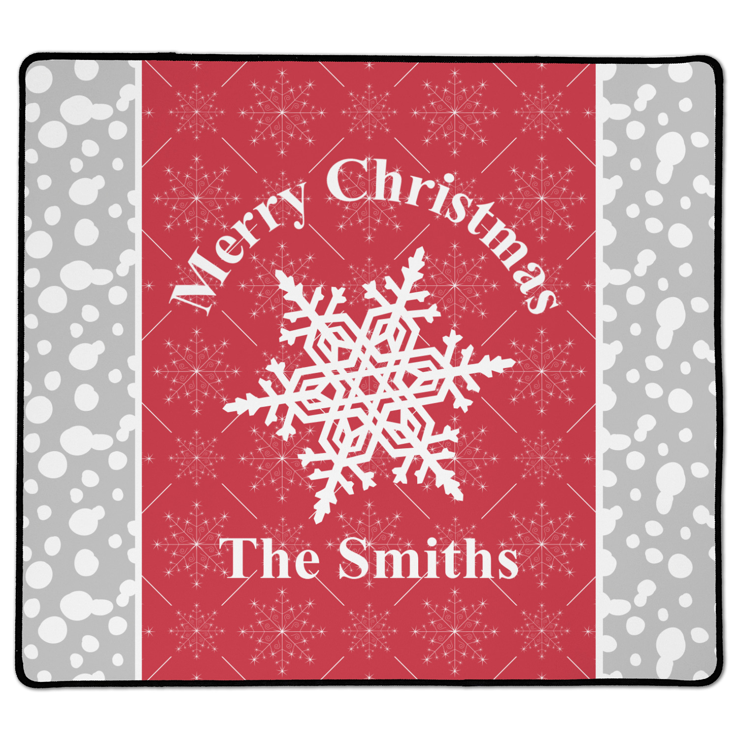 This design idea shows a calm grey and white snowflake filled background on either side of a red and white snowflake pattern in the middle. A big white snowflake have your greeting and personalization above and below it. This is a wonderful design idea to get your Christmas decorations started!