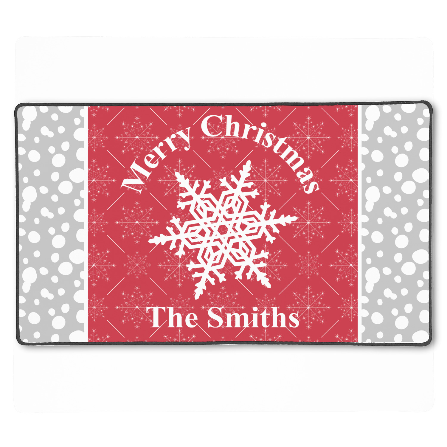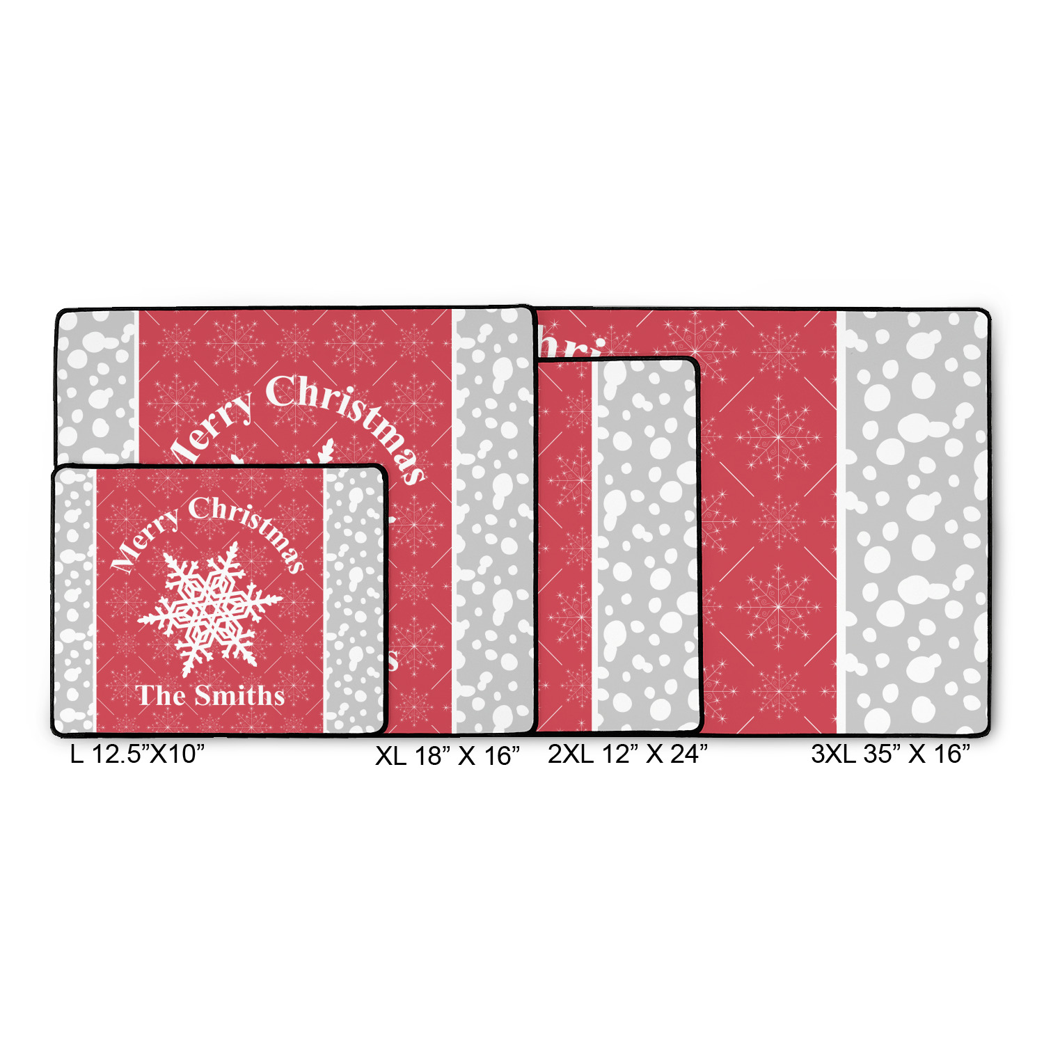 This design idea shows a calm grey and white snowflake filled background on either side of a red and white snowflake pattern in the middle. A big white snowflake have your greeting and personalization above and below it. This is a wonderful design idea to get your Christmas decorations started!