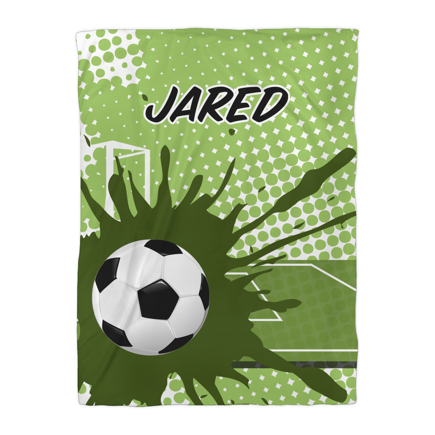 This fun design has a cool abstract background with a soccer field and splatters of different shades of green. There is a soccer ball in the left corner of the design while your personalization goes towards the top. This is a great design for any teen or kid who loves soccer. Easily change the neutral colors to something more masculine or feminine.