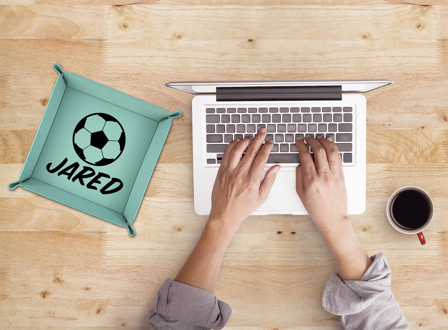 This fun design has a cool abstract background with a soccer field and splatters of different shades of green. There is a soccer ball in the left corner of the design while your personalization goes towards the top. This is a great design for any teen or kid who loves soccer. Easily change the neutral colors to something more masculine or feminine.
