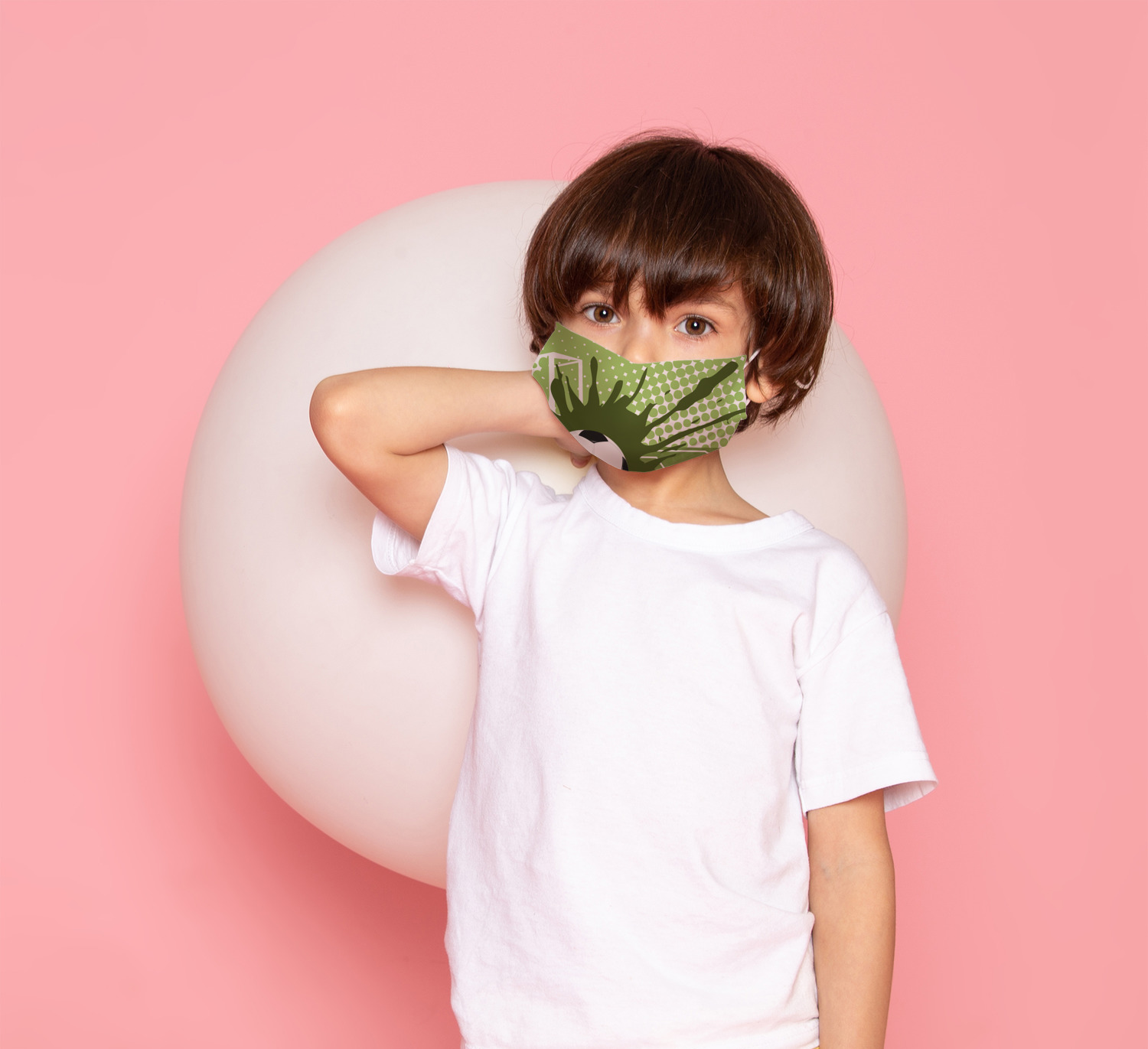 Our kids's masks are available in two sizes - Extra Small and Standard. The extra small are designed to fit 2-4 year olds, and the small to fit 4-10 year olds. The extra small face mask measures 6.25 inches wide by 3.25 inches tall, while the standard size measures 6.5 inches wide by 3.5 inches tall.
