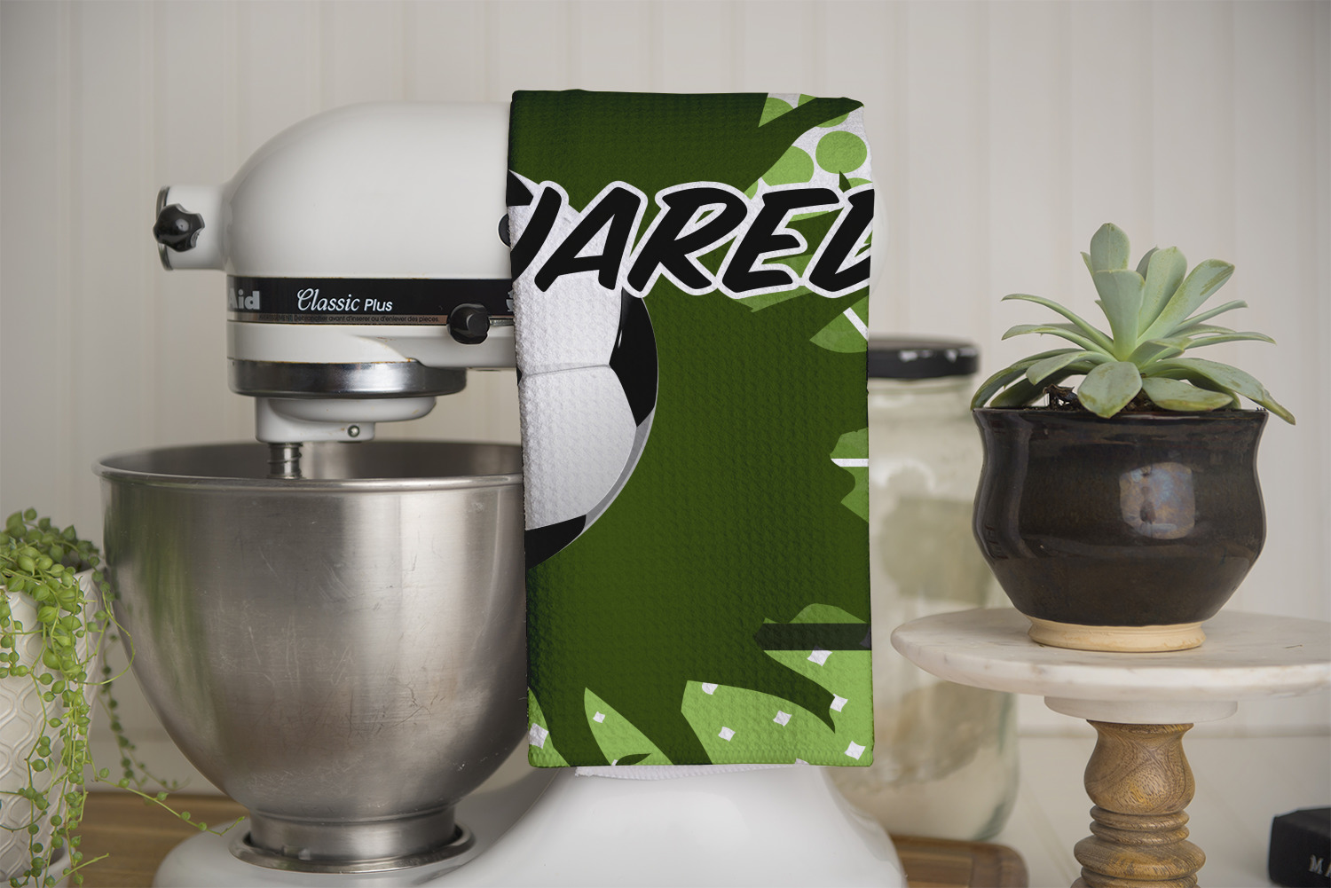 This fun design has a cool abstract background with a soccer field and splatters of different shades of green. There is a soccer ball in the left corner of the design while your personalization goes towards the top. This is a great design for any teen or kid who loves soccer. Easily change the neutral colors to something more masculine or feminine.