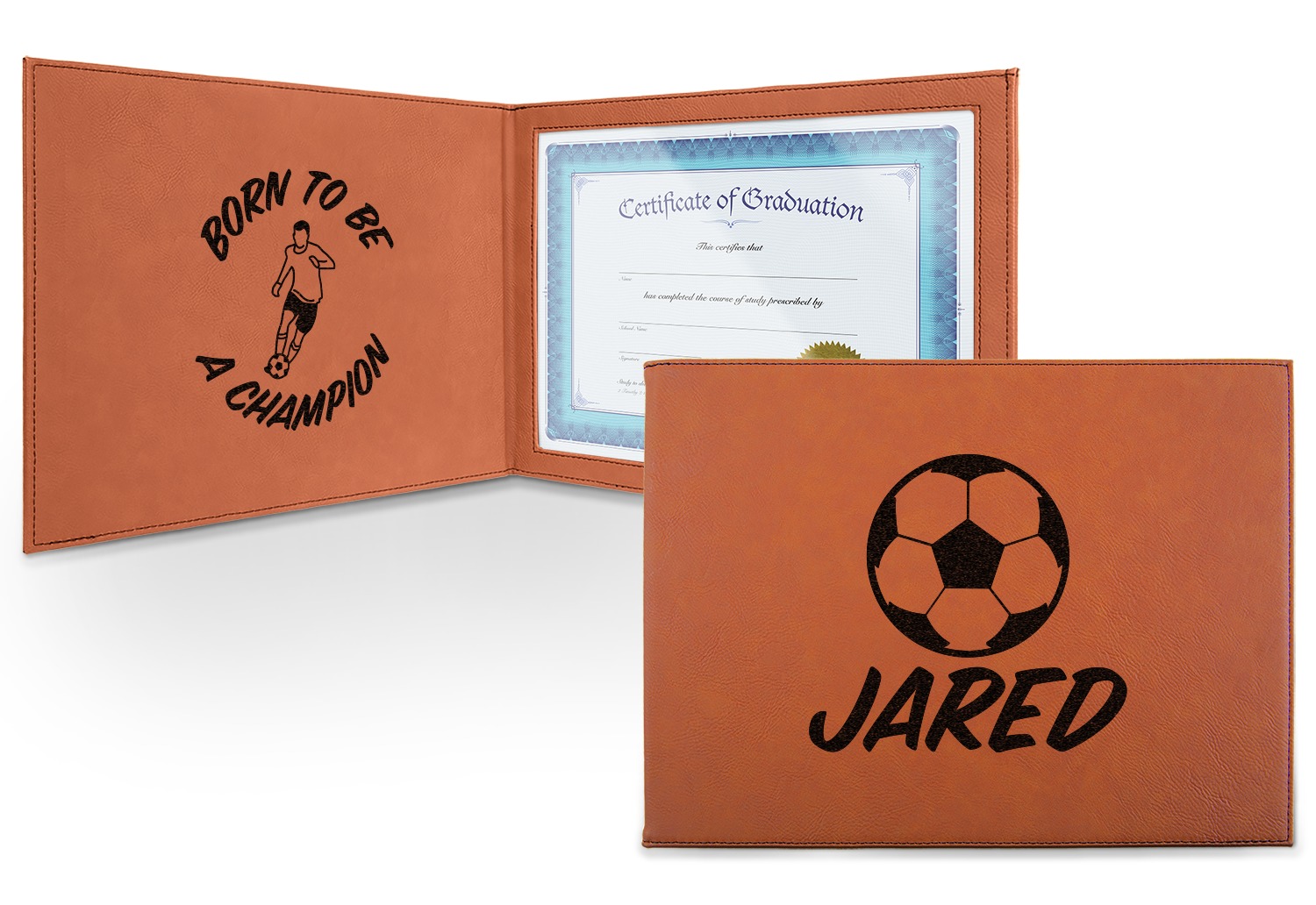 This cognac-colored, leatherette certificate jacket is the ideal way to display or store your hard-earned certificate. When closed, the custom certificate holder measures at 12 by 9 inches. The interior of the certificate cover includes a clear, vinyl window to encase your diploma. The window measures at around 10.5 by 7.5 inches and can accommodate a diploma that measures at up to 8.5 by 11 inches. You can either choose to have your customization laser engraved on the front and interior, or solely the front.