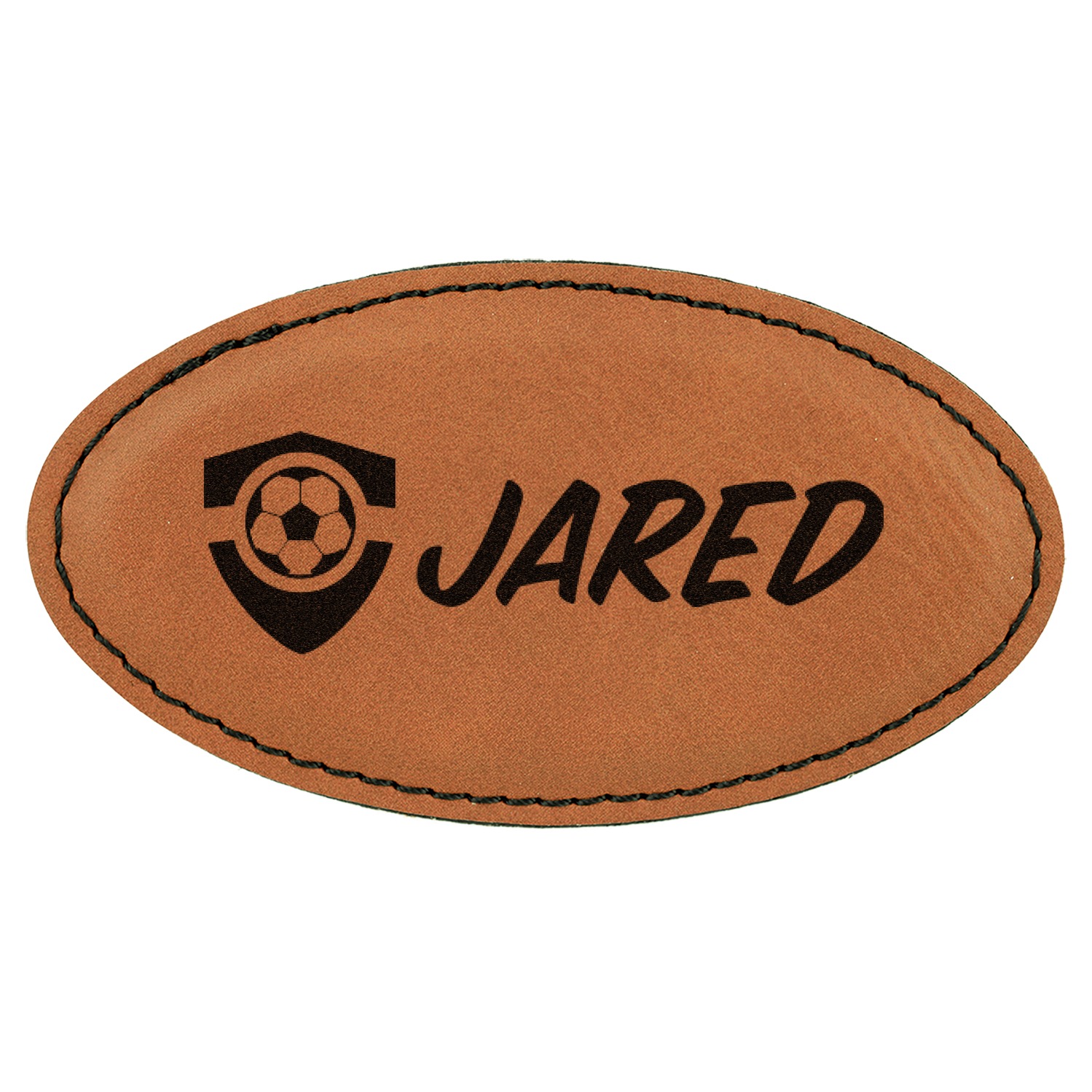 Made from a cognac-brown leatherette into an oval shape, these custom name badges measure at around 3.25" x 1.75". To add the suave appearance of this custom badge, a fine black stitching lines the edges or the badge itself. Your customized design is laser-engraved onto the surface of the leatherette. Accompanying your purchase is a removable magnet strip that can be used to secure the engraved name tag to any shirt, dress, or jacket.