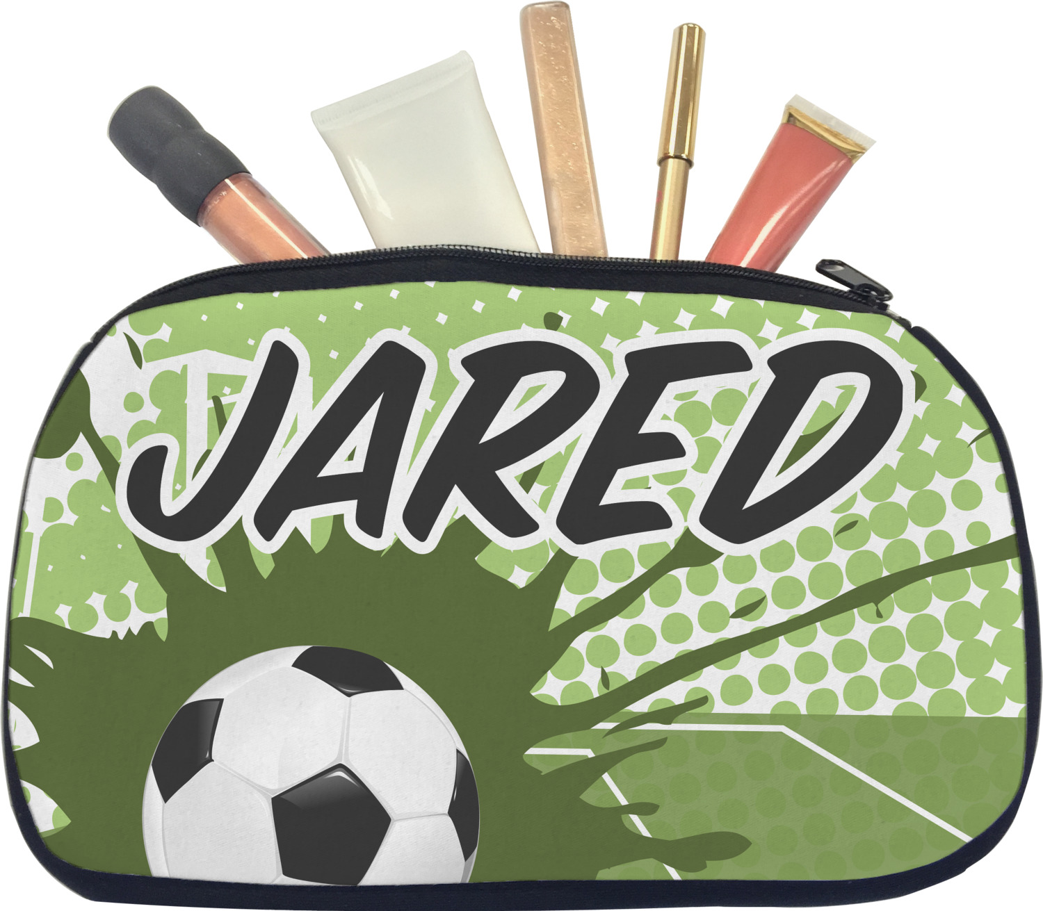 Our personalized makeup bags are available in many different designs, patterns and colors - so you are sure to find one that will love. They are made of neoprene (same material as wet-suits) and thus are water resistant, so spillages in your makeup bag will not end up all over you purse. They are customized on one side and are black on the other side and the zipper is black as well.