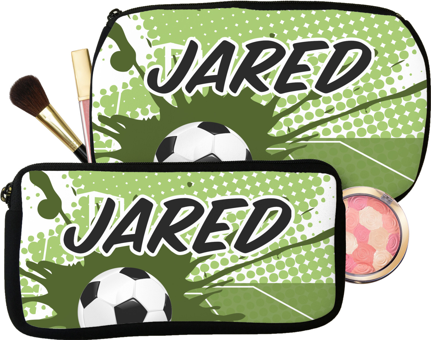 Our personalized makeup bags are available in many different designs, patterns and colors - so you are sure to find one that will love. They are made of neoprene (same material as wet-suits) and thus are water resistant, so spillages in your makeup bag will not end up all over you purse. They are customized on one side and are black on the other side and the zipper is black as well.