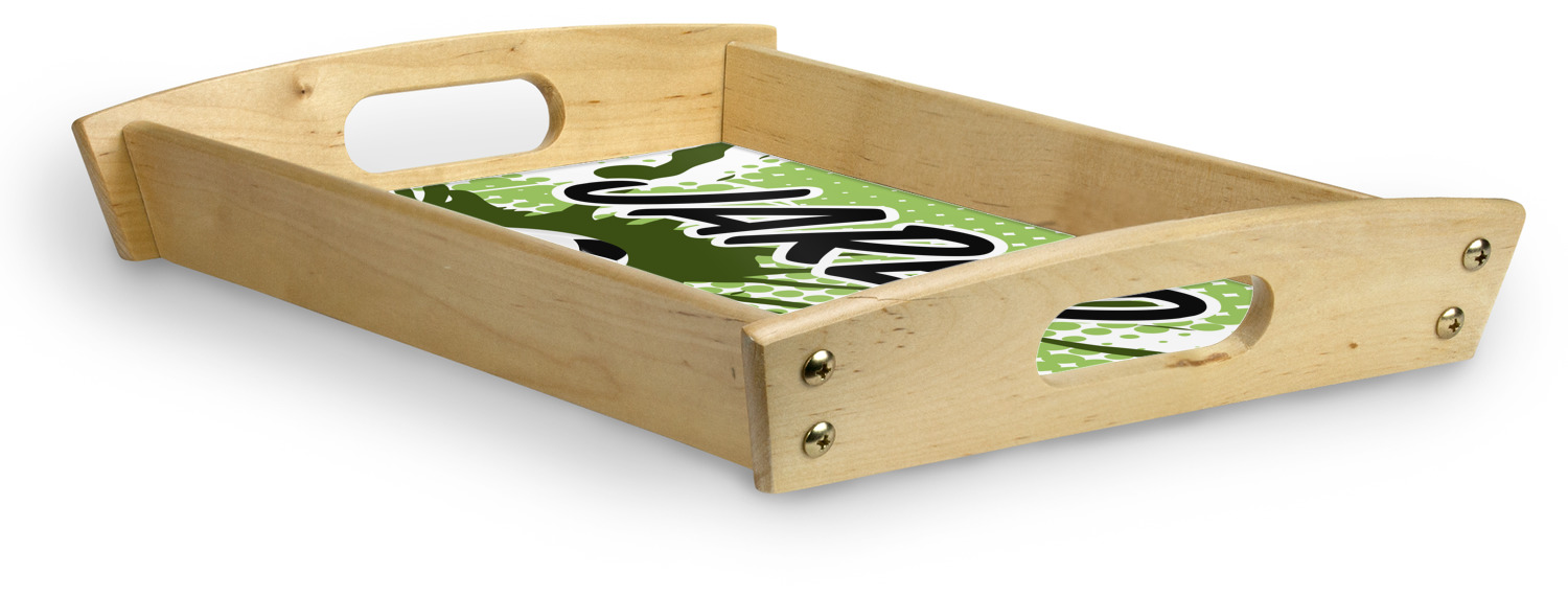 This serving tray with handles features square edges and two rounded sides, creating a very modern look. Each side is fabricated from a beautifully cut, natural wood. The bottom of the interior of the tray displays your customized design in bright, vibrant color. The tray is sold in both a black color and a natural wood look. Each variation of the wood serving tray has two sizes: Small, which is 14" x 10" x 2.25", and Large, which is 19.5" x 13.5" x 2.75".