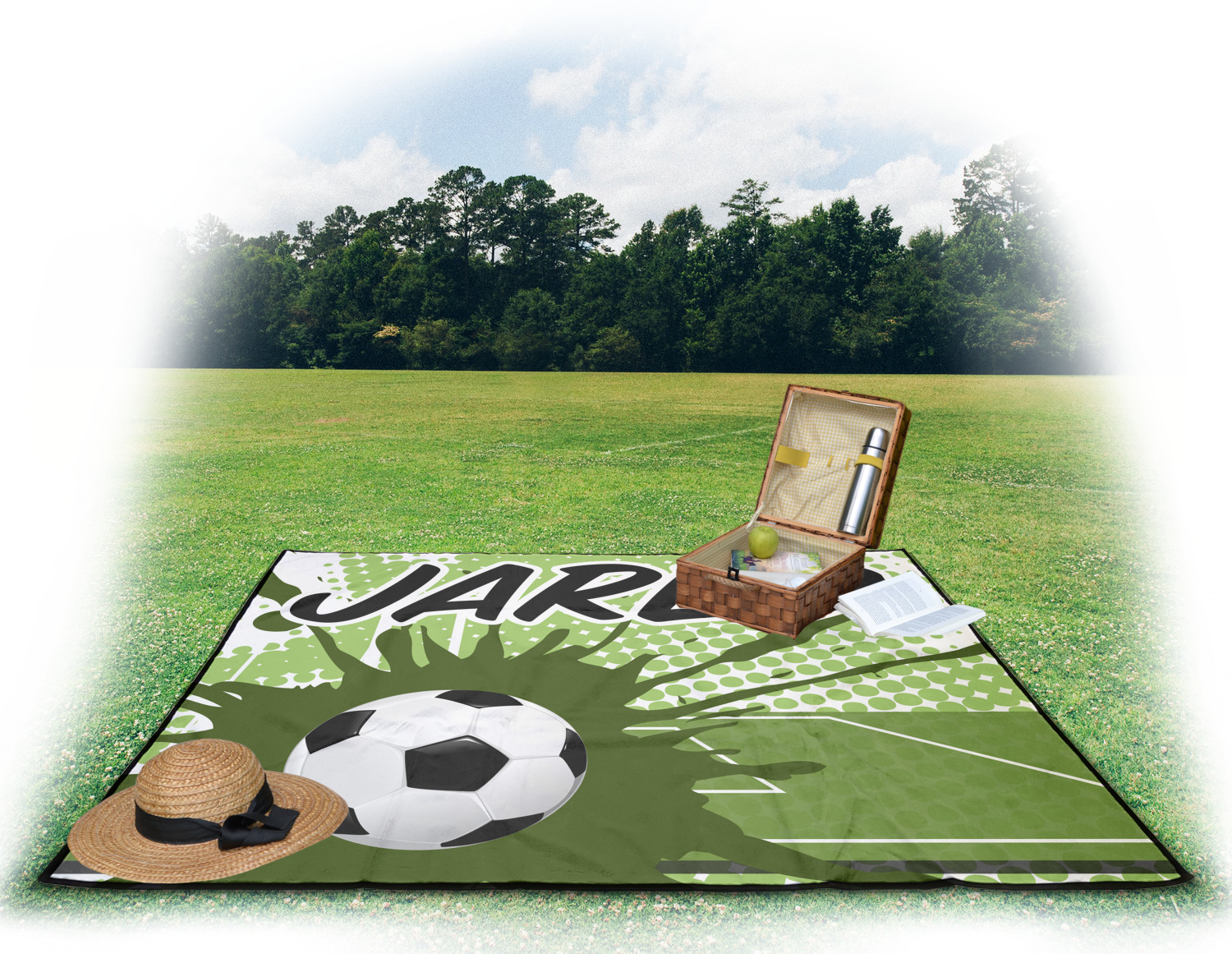 This picnic blanket is perfect for hanging out with your friends at the park or anywhere outside. The top of the blanket is made of a super soft microfiber fleece. The bottom of the blanket is made of a black material similar to a rain jacket and is water repellent as well. This will keep any wet spots on the ground from soaking through your picnic blanket. No one likes a wet blanket. The blanket measures at approximately 50" x 59" and has a nicely finished ribbon edge.