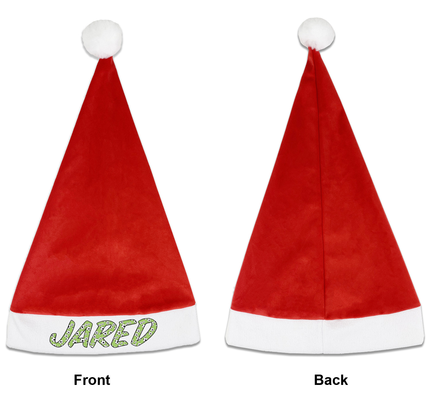 Our Santa hats are a soft, velvety polyester material. These customizable Santa hats are a classic red with white brimming and pom pom ball hanging off the hat tail just like Santa Claus! Each personalized Santa hat is approximately 17.5 L x 11.8 W. We offer two different styles to print your designs on the white brim - front or front & back.