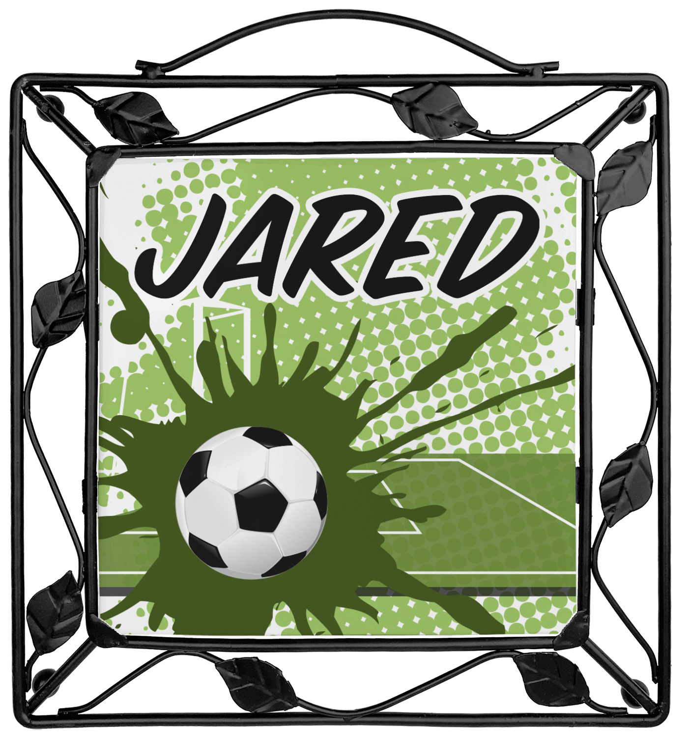 Our square trivets are made from a durable, wrought iron. This model features 4 small half circles, one on each corner, and a larger ring of iron that circles the central, customized tile. Each of the 4 corners has a round foot on its bottom for stability. This trivet is 8.75 by 8.75 inches, but the central tile measures at 6 inches on both sides.