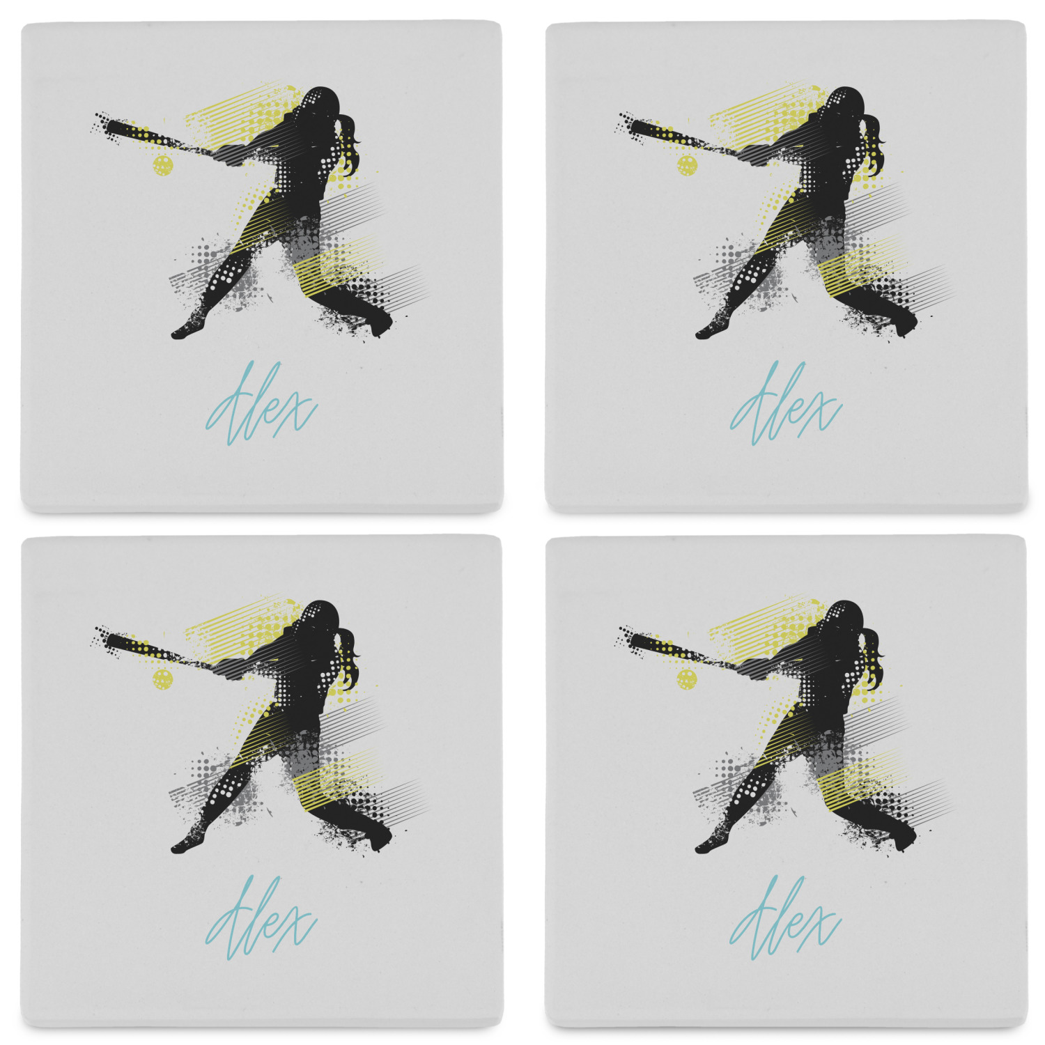 This design is a blast of fun colors. You'll find a light teal / turquoise, bright yellow-green, red-orange, and black. The main image is a softball with splatters around it creating a feeling of movement. The coordinating design displays silhouettes of softball players that look like they're in action. This is the perfect fun design for any teen girl that just loves softball!