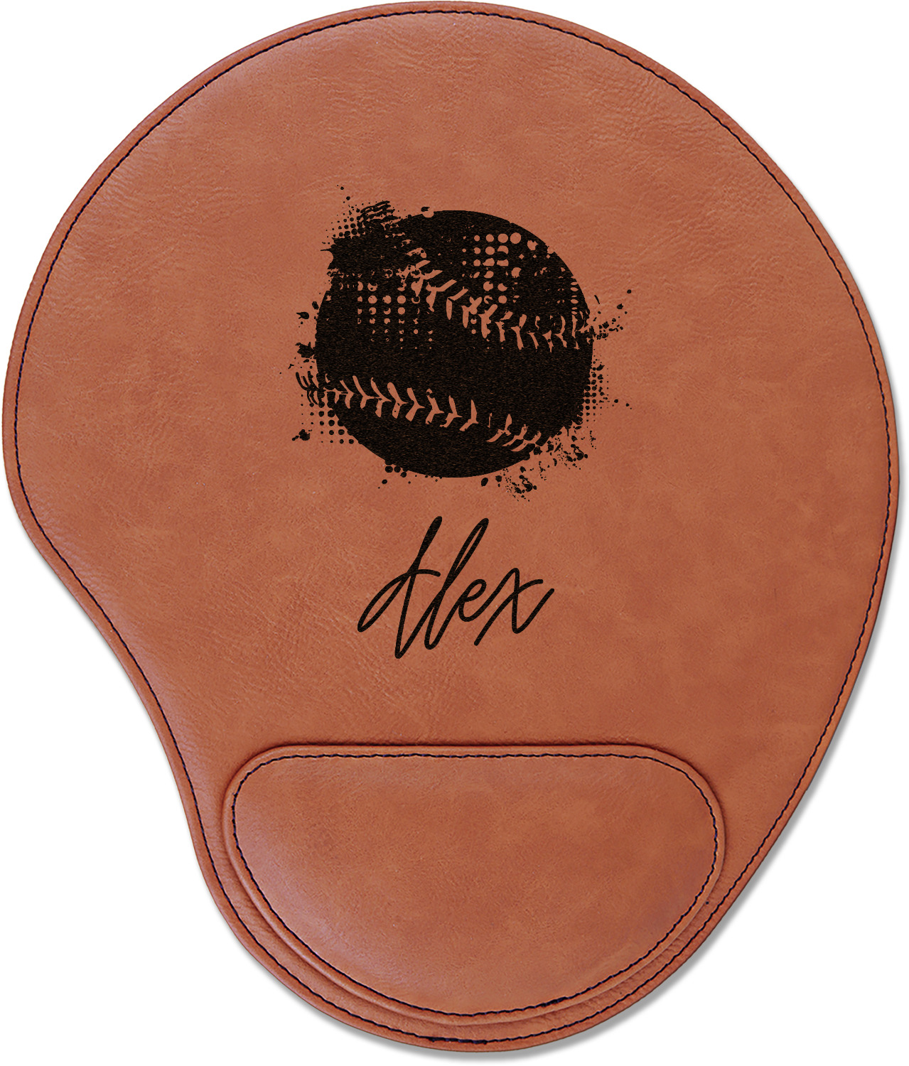 In a rounded shape, this mouse pad is made of a luxurious, cognac-colored leatherette. The nature of this material allows your mouse to glide smoothly across its surface. Strong stitching lines the edges to guarantee stability and strength. As added support for tired wrists, your personalized mouse pad features a supportive wrist rest at its bottom. This model measures at 10.25" x 9", while its wrist pad is approximately 5" x 2.75", with a thickness of 0.75". Your personalized design is laser engraved into the front face of this mouse pad.