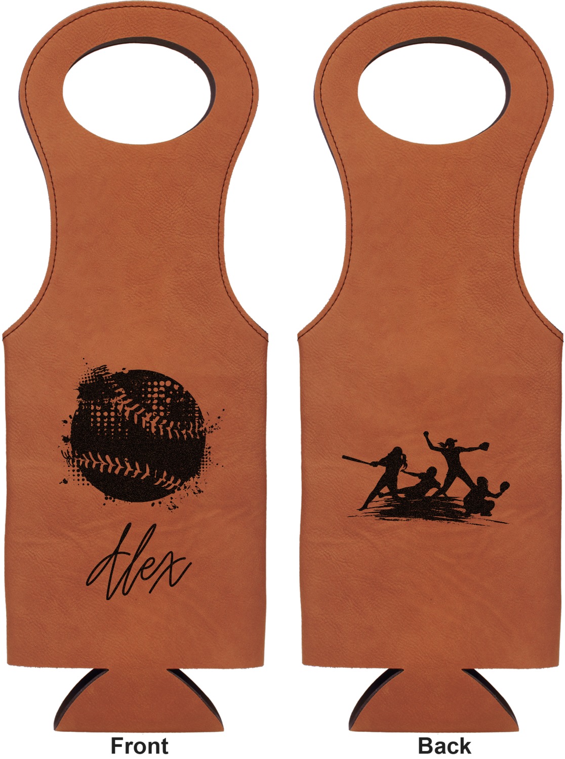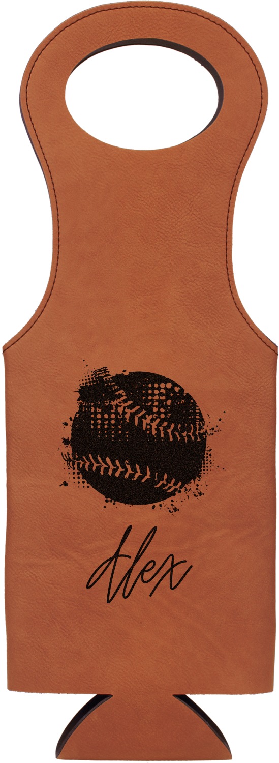 This wine carrier is made from a stunning leatherette, in a cognac-brown color. Strong, black stitching lines the sides of your wine bottle bag and provides extra durability. The interior is lined with a padded, black material to allow for a snug fit once your bottle is placed inside. At the top of this wine gift bag, you'll find two oval shaped handles that elegantly complements the rest of the bag's style. We provide you with the option of laser-engraving the front, or the front and back of your new personalized wine bag!