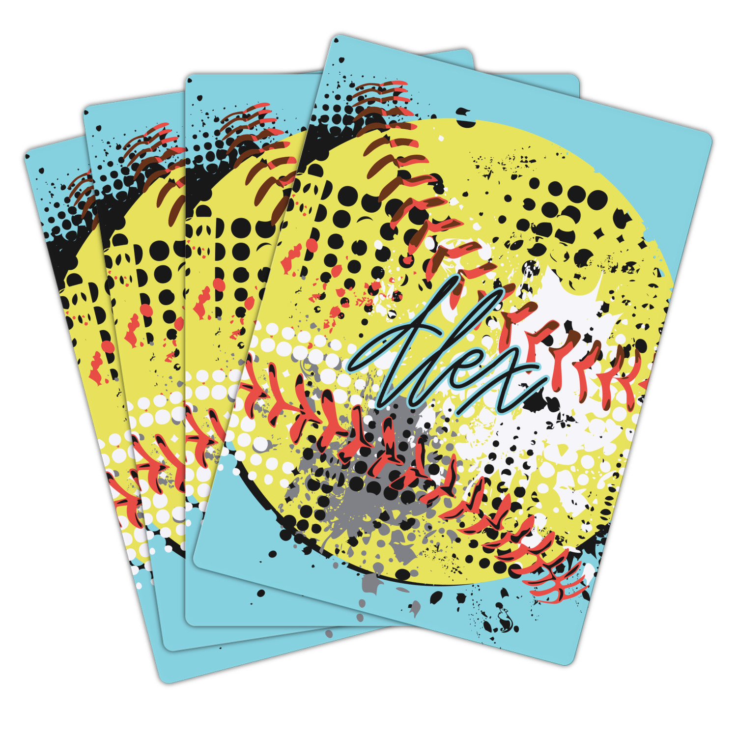 This design is a blast of fun colors. You'll find a light teal / turquoise, bright yellow-green, red-orange, and black. The main image is a softball with splatters around it creating a feeling of movement. The coordinating design displays silhouettes of softball players that look like they're in action. This is the perfect fun design for any teen girl that just loves softball!