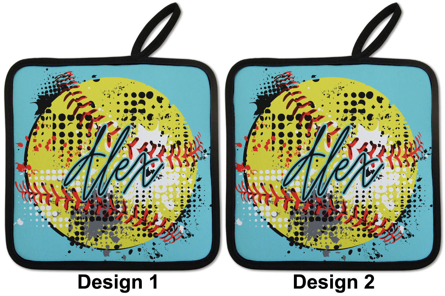Our personalized pot holders feature a neoprene front that displays your personalization in vibrant colors. The backing of the hot pot holder is rubberized; the textured backing allows you to have a great grip when using this custom pot holder. The two materials are joined with a sleek, black trim, and the holder also includes an attached loop for hanging and storage. The pot holder is approximately 8.75 inches by 8.75 inches and 0.25 inches tall, while the fabric loop is 2.5 inches long. You can purchase a kitchen pot holder by itself or as a set of 2. We also offer a set including one pot holder and one oven mitt.